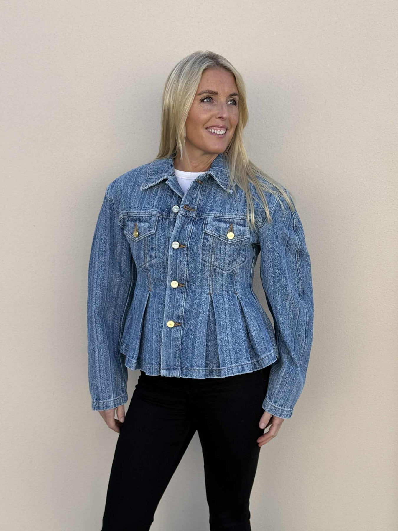 Denimjakken har en klassisk krage, knappelukking foran, to brystlommer og en plissert detaljen i midjen.