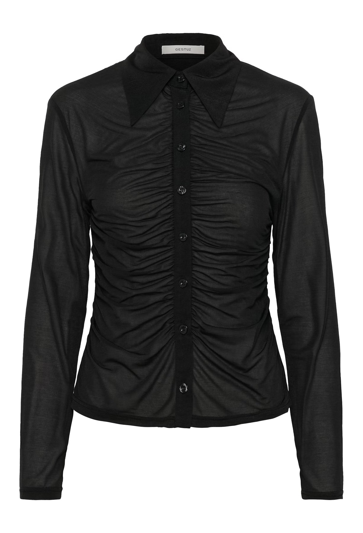 Rå transparent skjorte fra Gestuz med stor skjortekrage og nydelige draperinger.