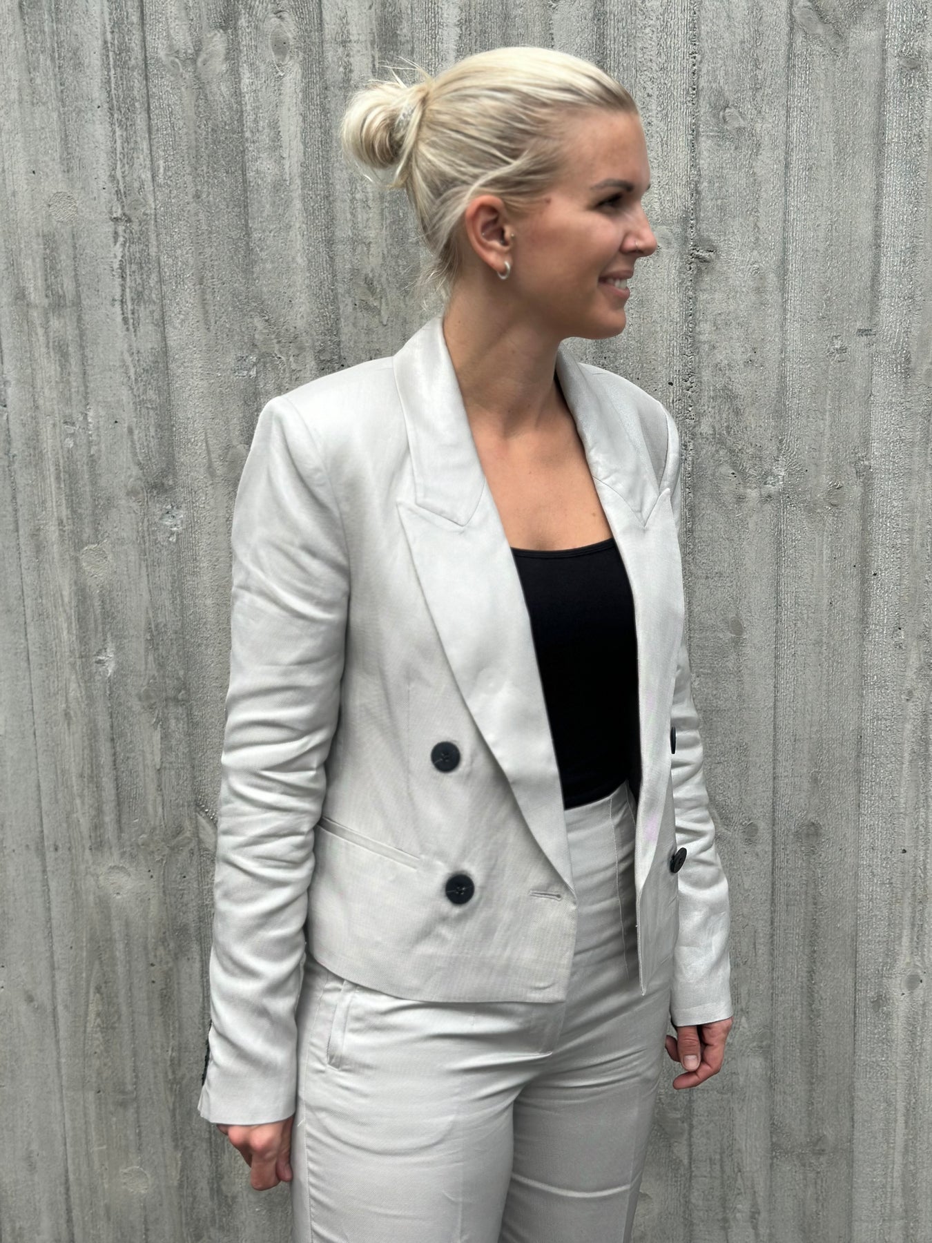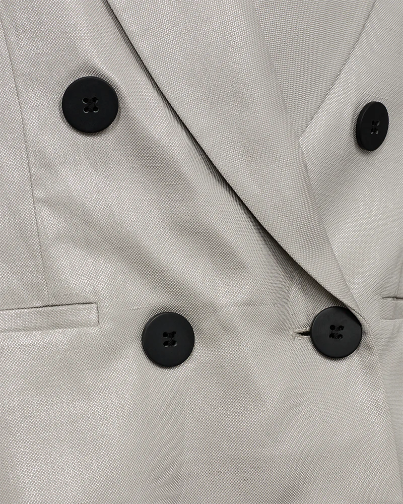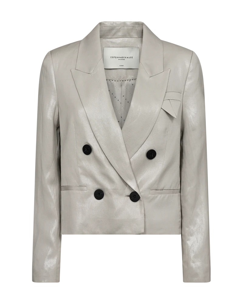 Natula Blazer fra Copenhagen Muse. Cropped dobbelspent boxy blazer i shiny utførelse. Rå sammen med buksa som passer til, men også kul til jeans og skjørt.