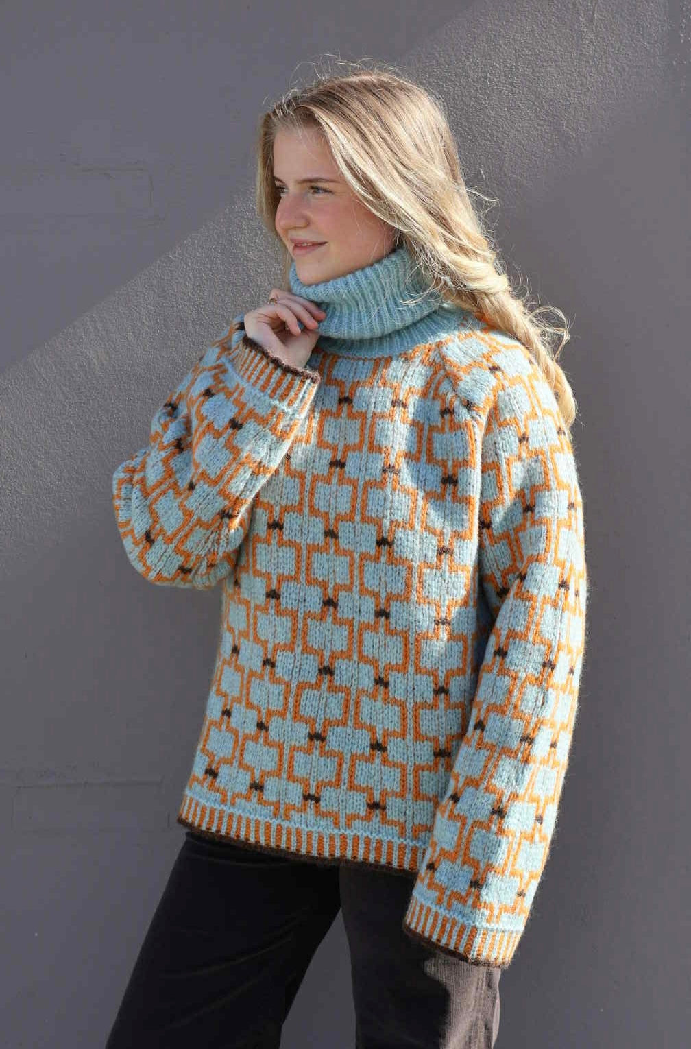 Solid og varm ullgenser fra Holzweiler i samarbeid med Skappelstrikk. Kult retro mønster med friske farger.
