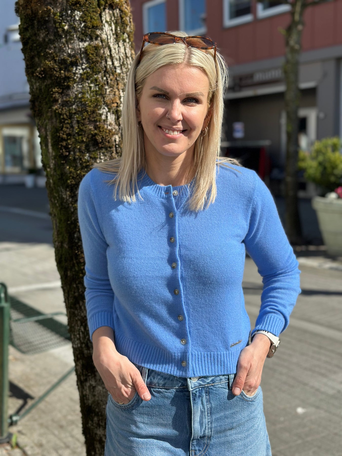 den populære kashmerecardigan fra Holzweiler i en fantastisk blåfarge. Så myk på og sitter som støpt. 100% kashmir