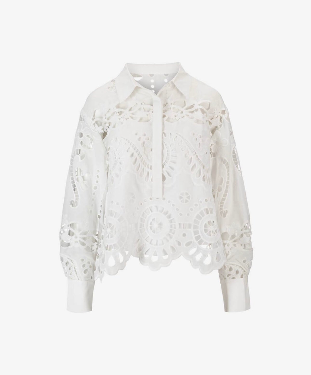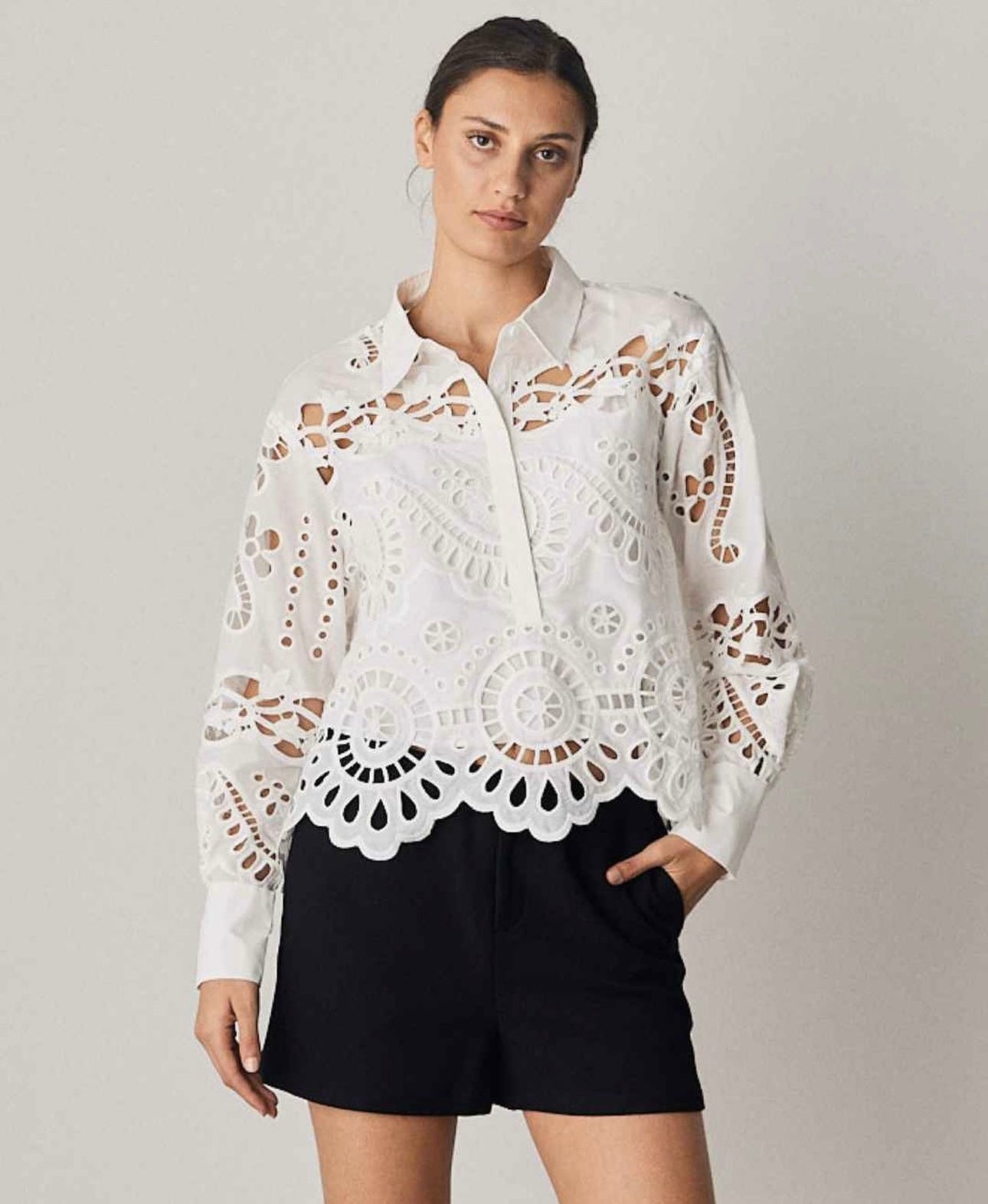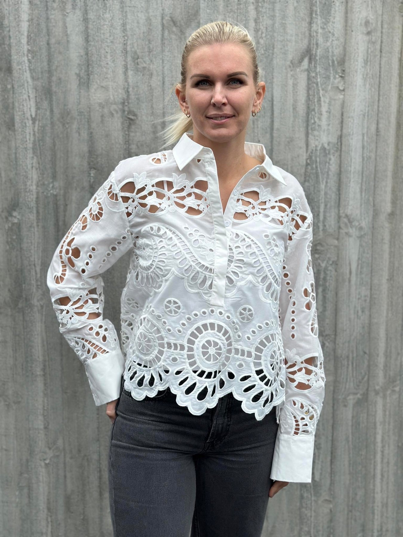 Et elegant plagg for garderoben din, med en krage, lange ermer og et stilig anglaisemønster av broderi. Denne allsidige blusen går enkelt fra uformelle utflukter til profesjonelle omgivelser, og tilbyr et kult og trendy utseende. Kle den opp til fester eller ned for shoppingturer – den er perfekt for enhver anledning. Hev stilen din med Lizzy-blusen, den ultimate blandingen av mote-fremad og tidløs appell.
