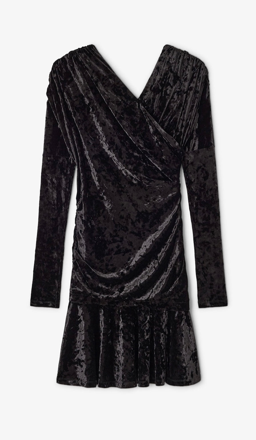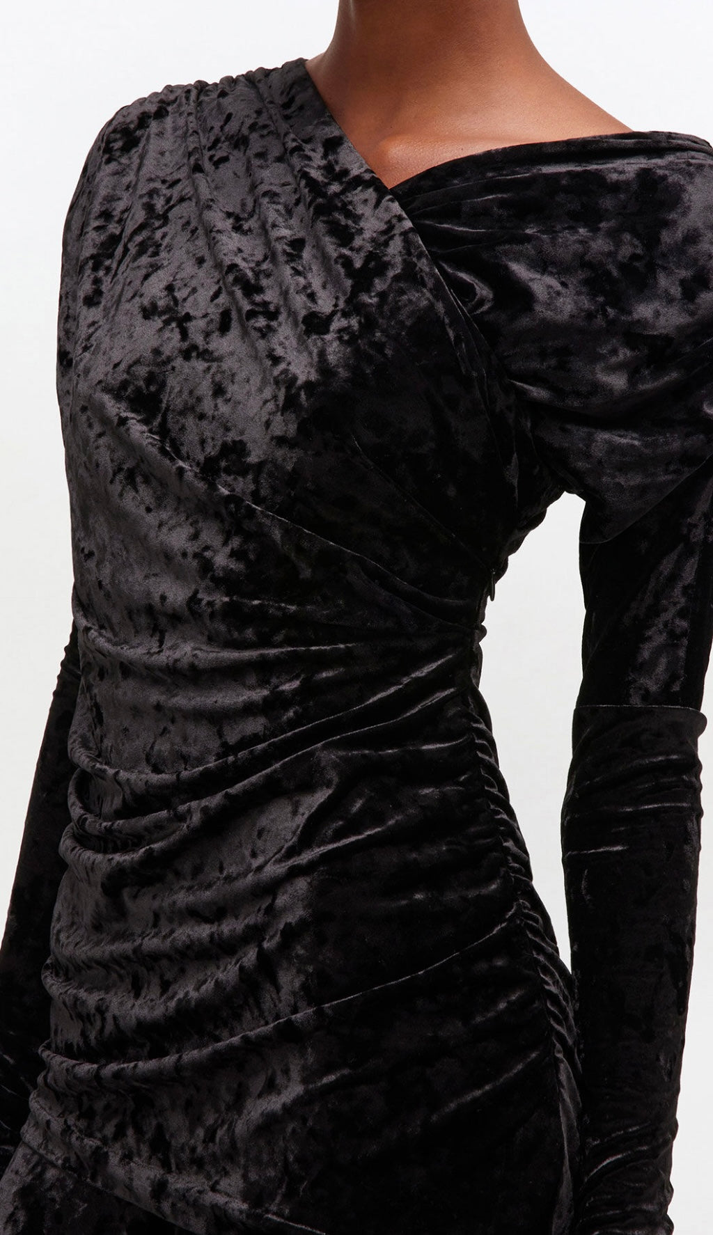 Nydlig kjole i velourstoff. Kjolen har asymmetrisk halslinning, lange armer og draperte rysjer langs bærestykket.