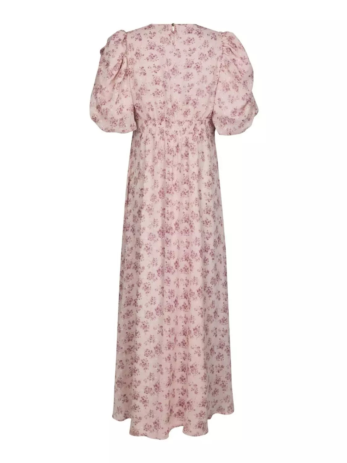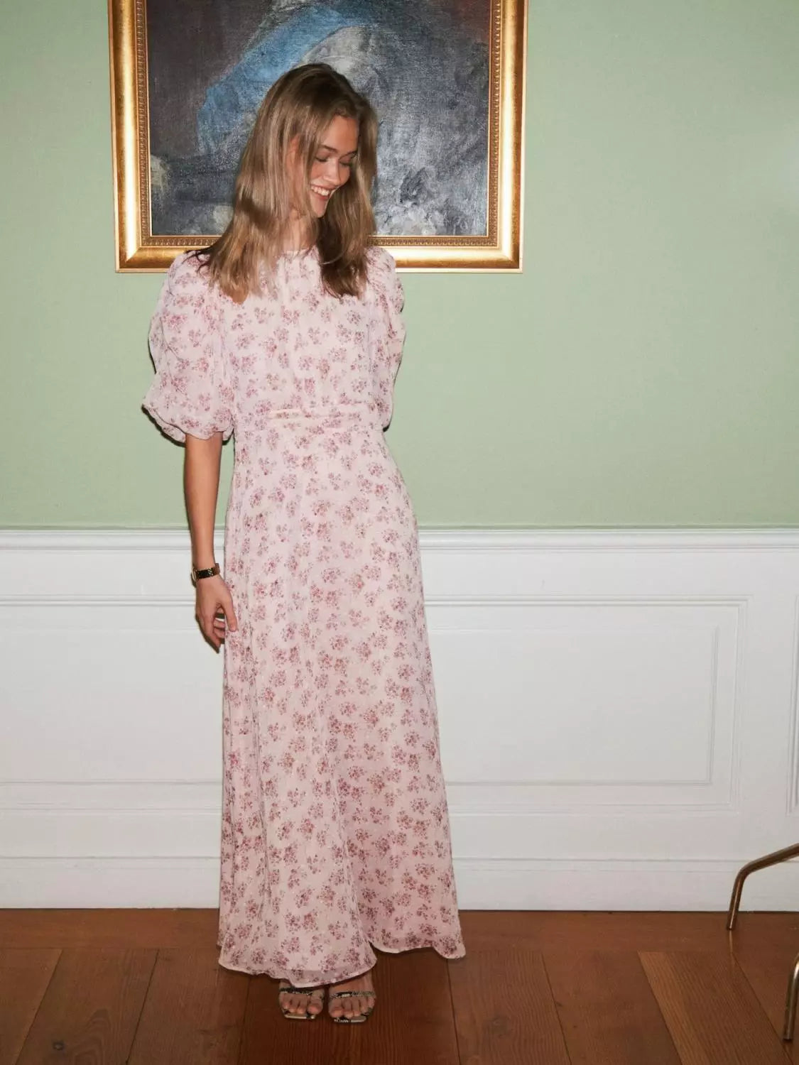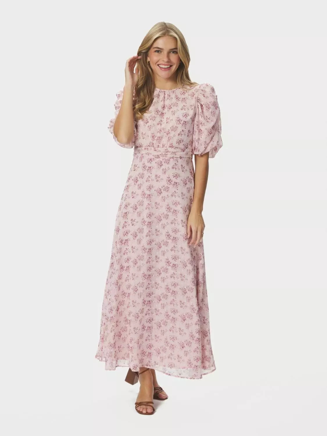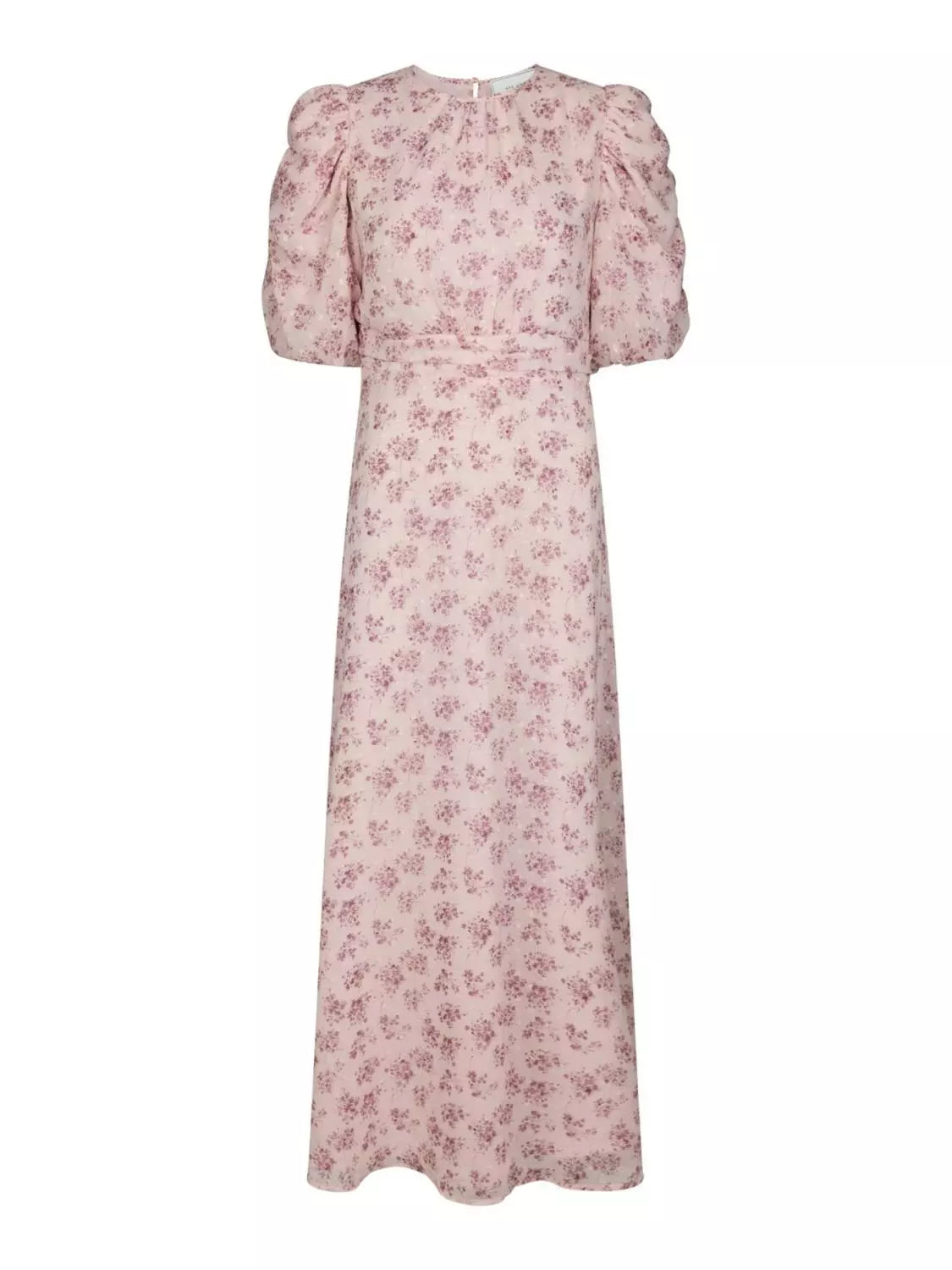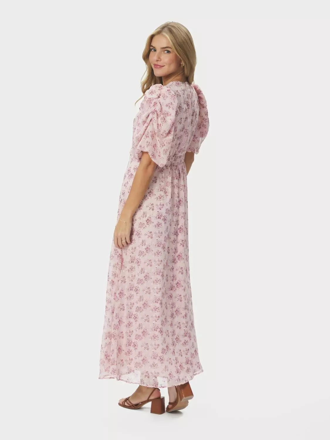 Nydelig, feminin lang kjole med et vakkert blomstermønster. Kjolen har 34-sleeves og smocking bak på livet. Kjolen har en knappelukking i halsen.