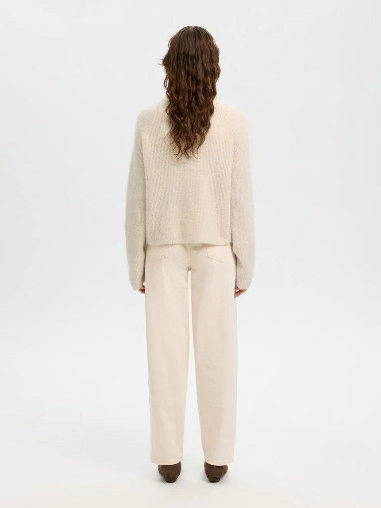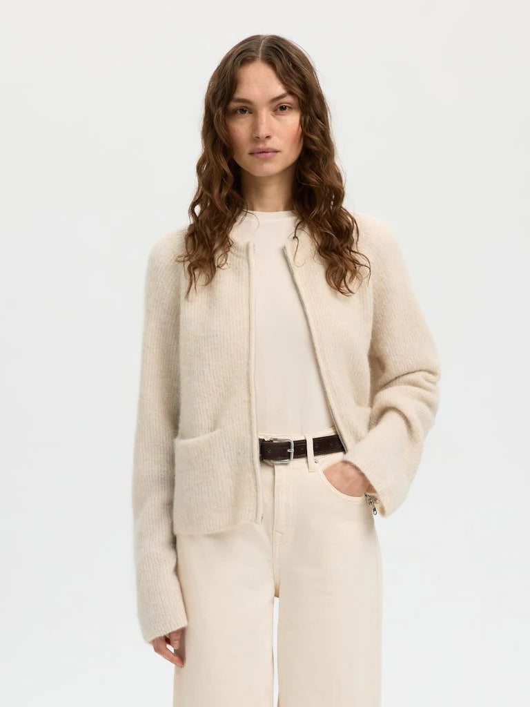 Ny modell i den populære Sia-serien fra Selected. Rund hals, zip og lommer i front. 43% ull, 30% alpakka, 23% nylon, 4% elastan