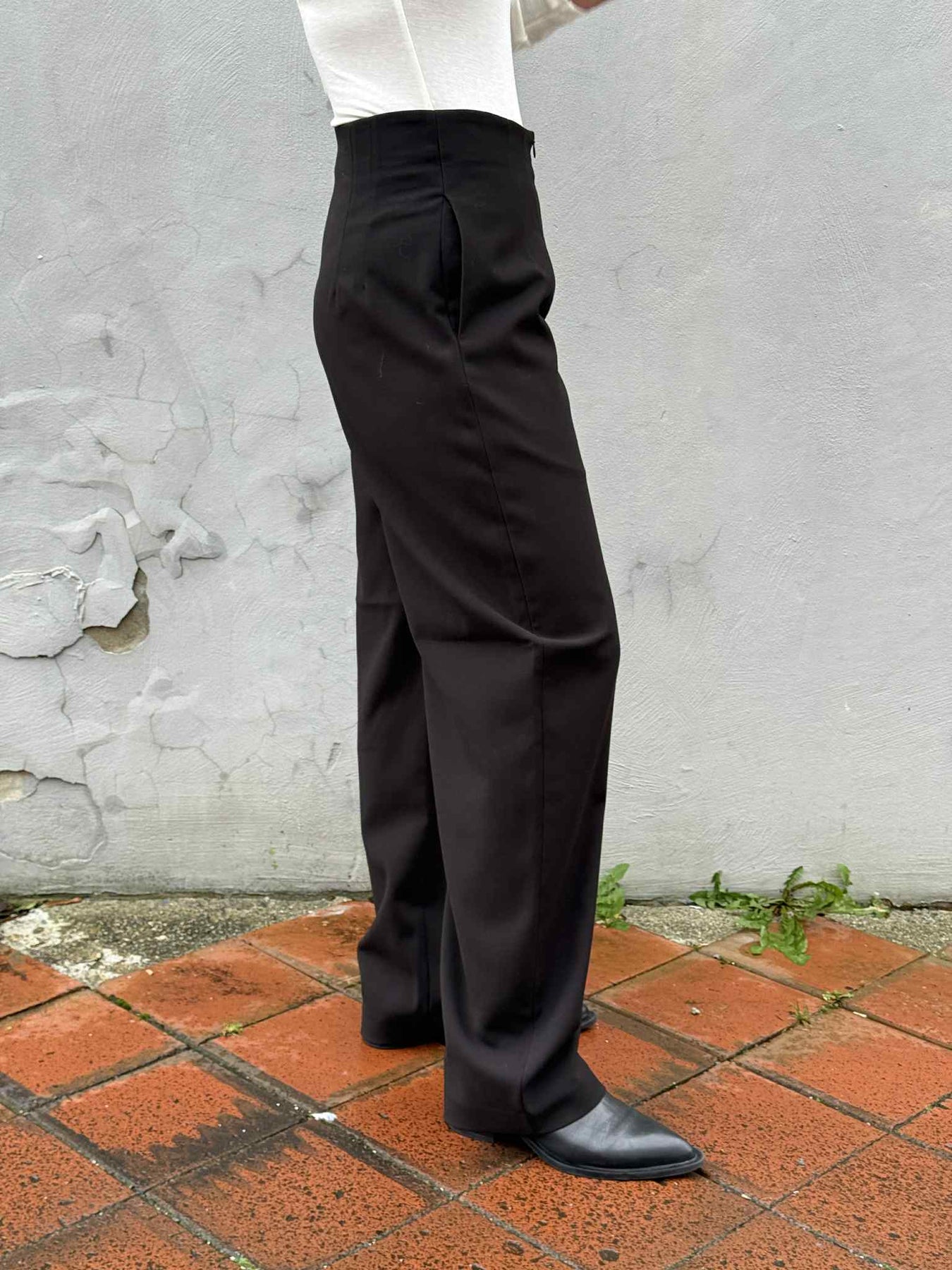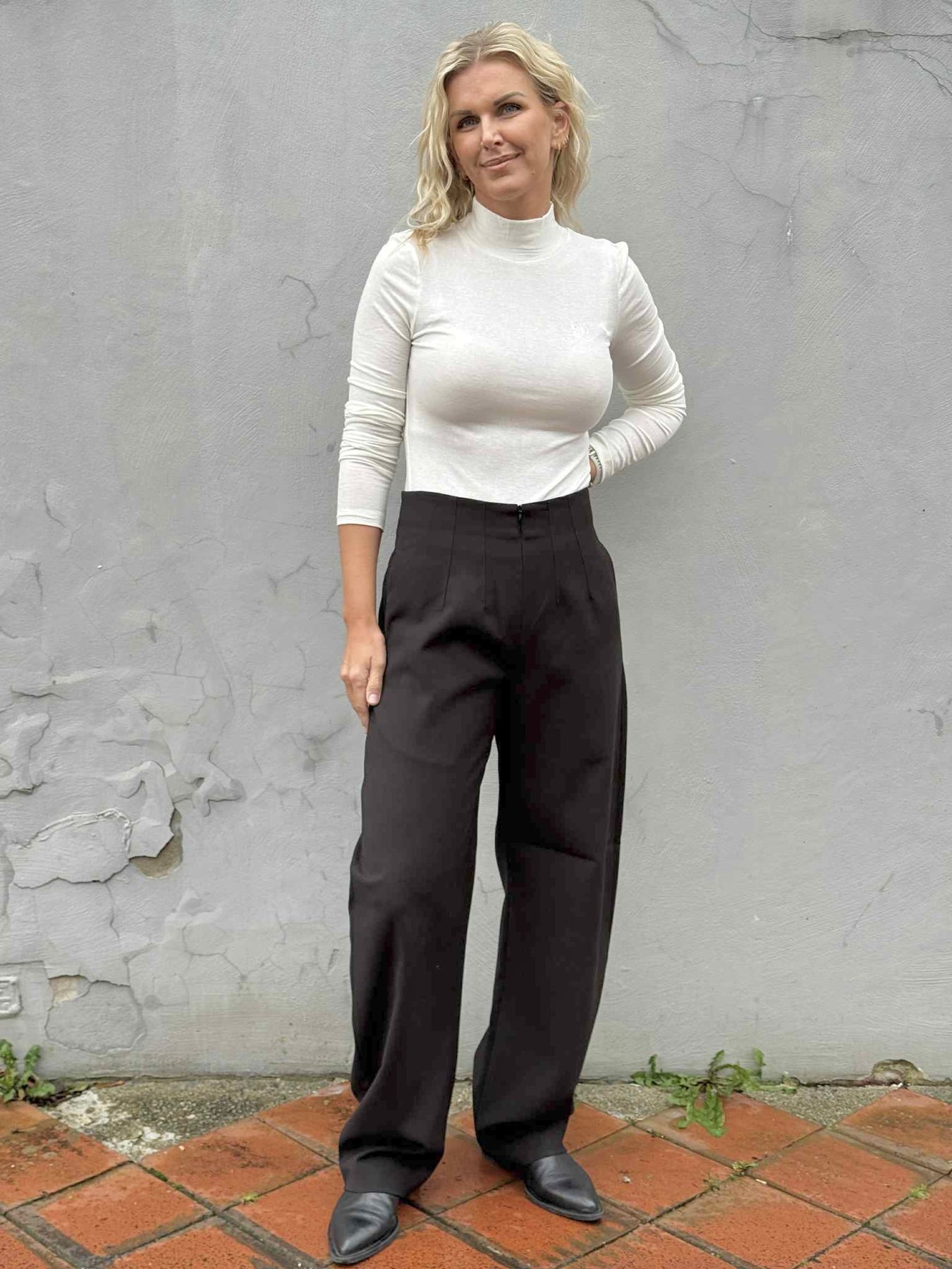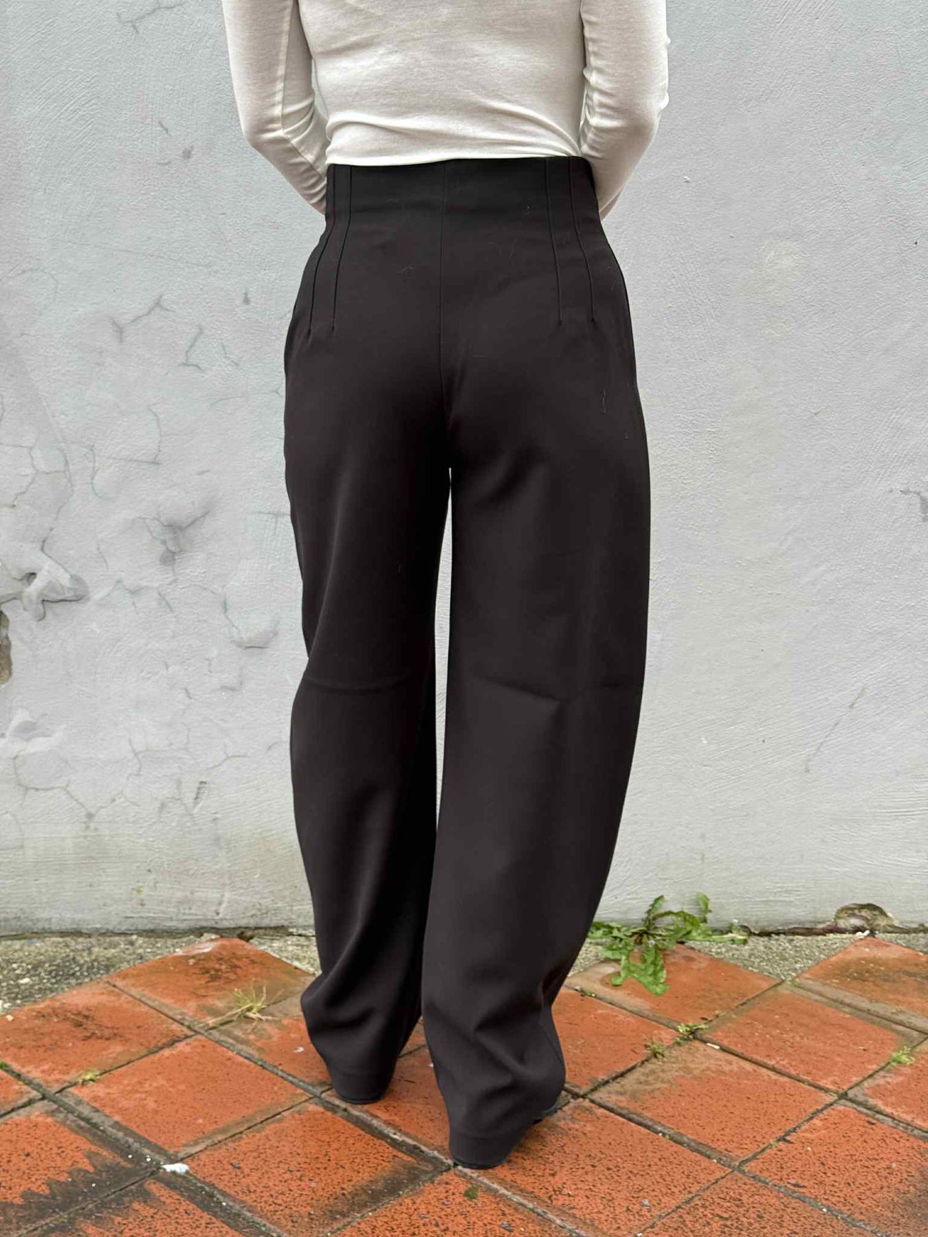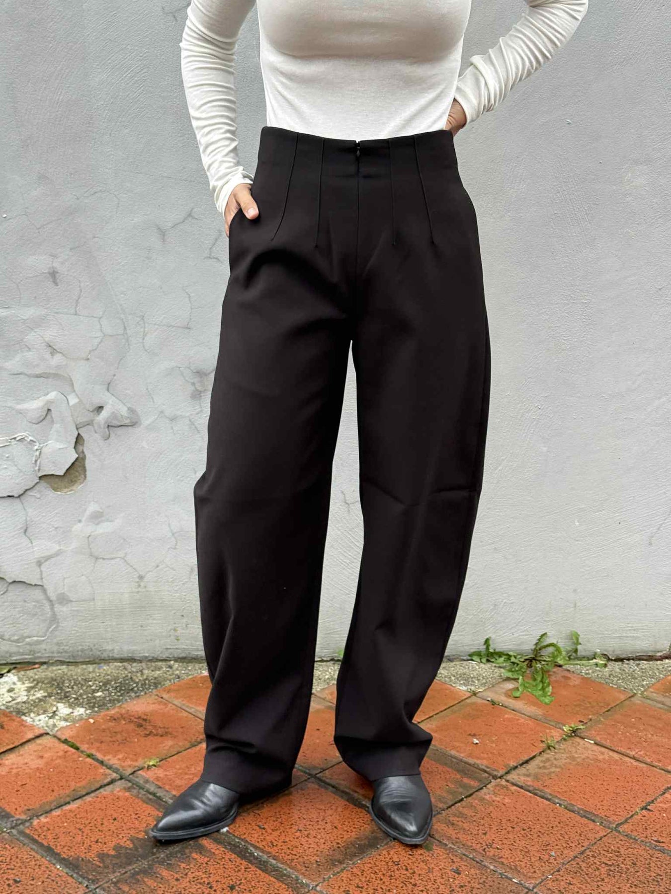 Barrel pant fra Iben . Trendy og klassisk bukse i et skikkligt kvalitetsstoff, innsvinget i livet som sitter høyt. Glidelås i front.