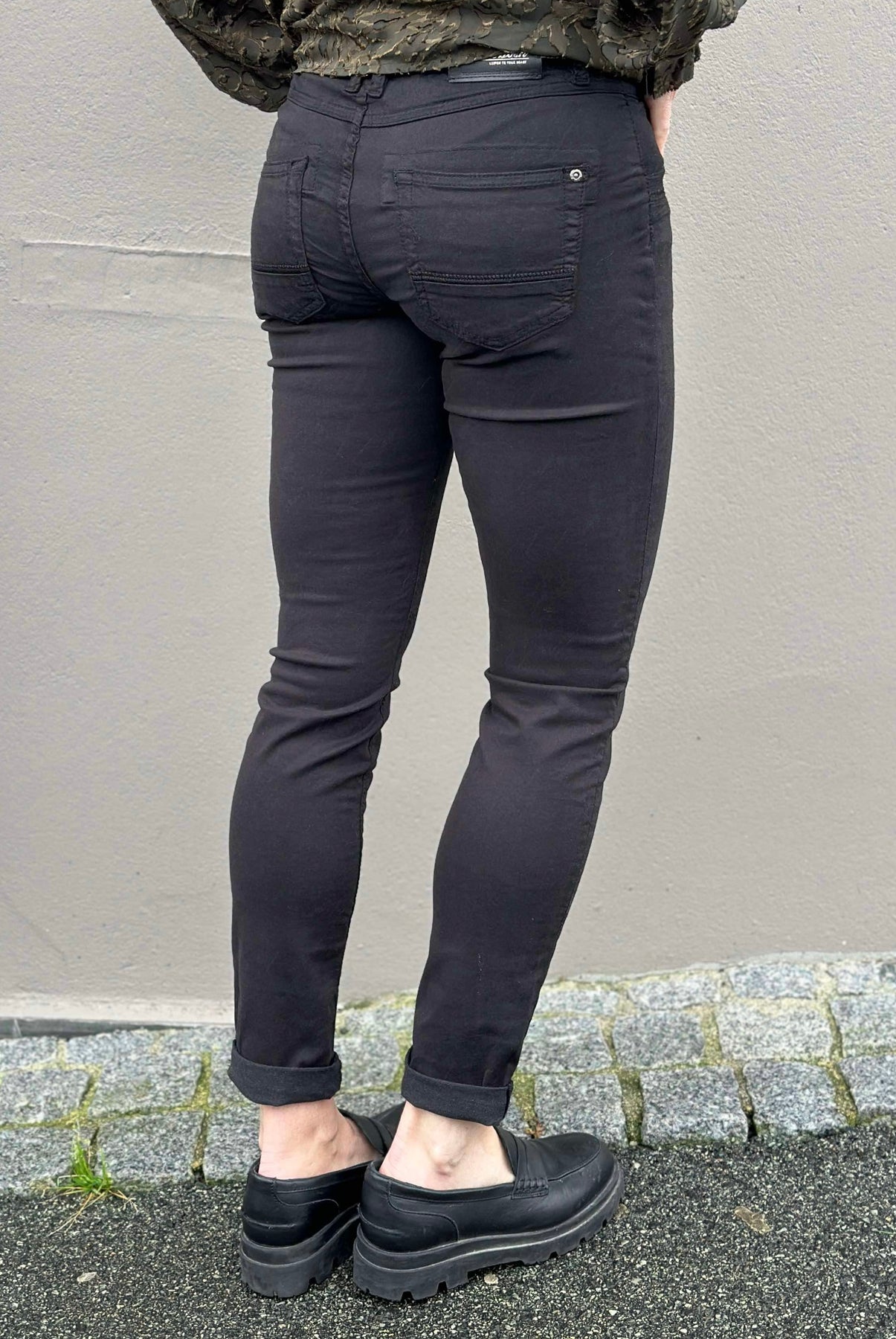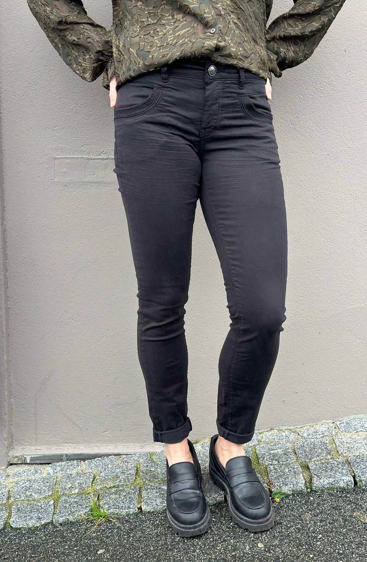 Fantastiske bukser, designet i vanlig konisk passform med høy/middels høyde, slik at du kan plassere dem på hoftene akkurat som du foretrekker. Avsluttet med broderte detaljer ved lommene og på baklommene. Oppsvinget nederst er perfekt for å vise frem fottøyet ditt. Bruk sammen med en lett strikk eller en statement-t-skjorte og cardigan.