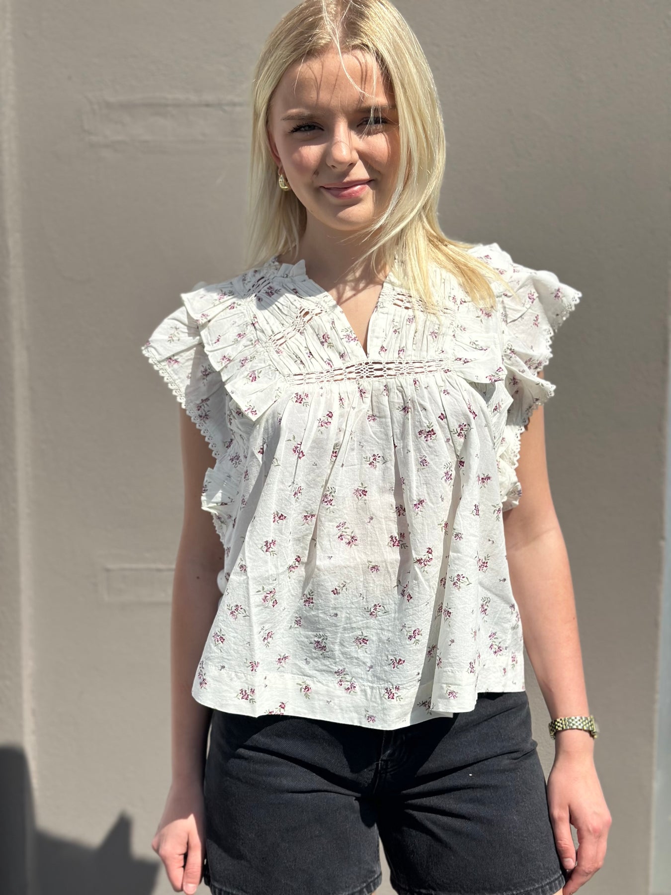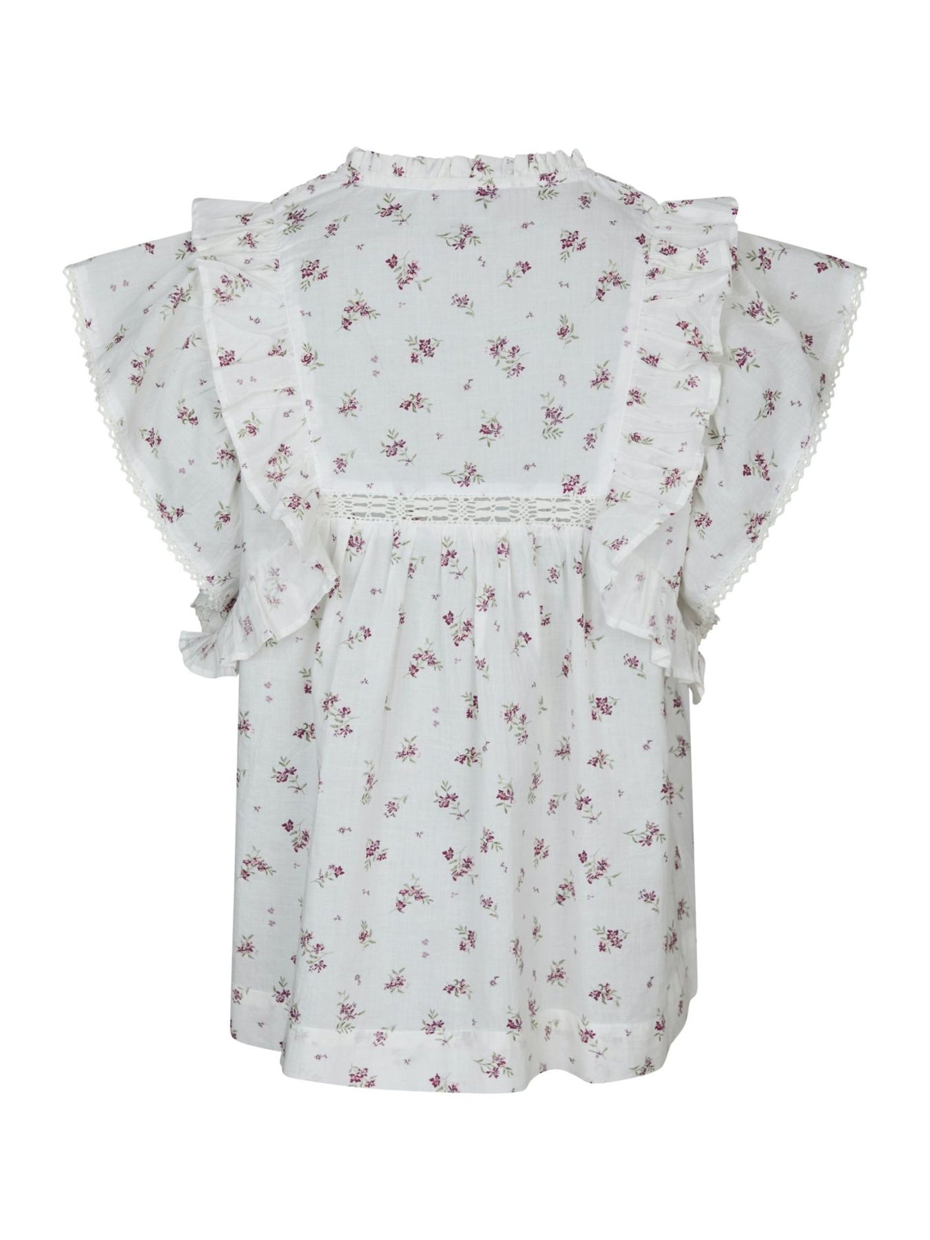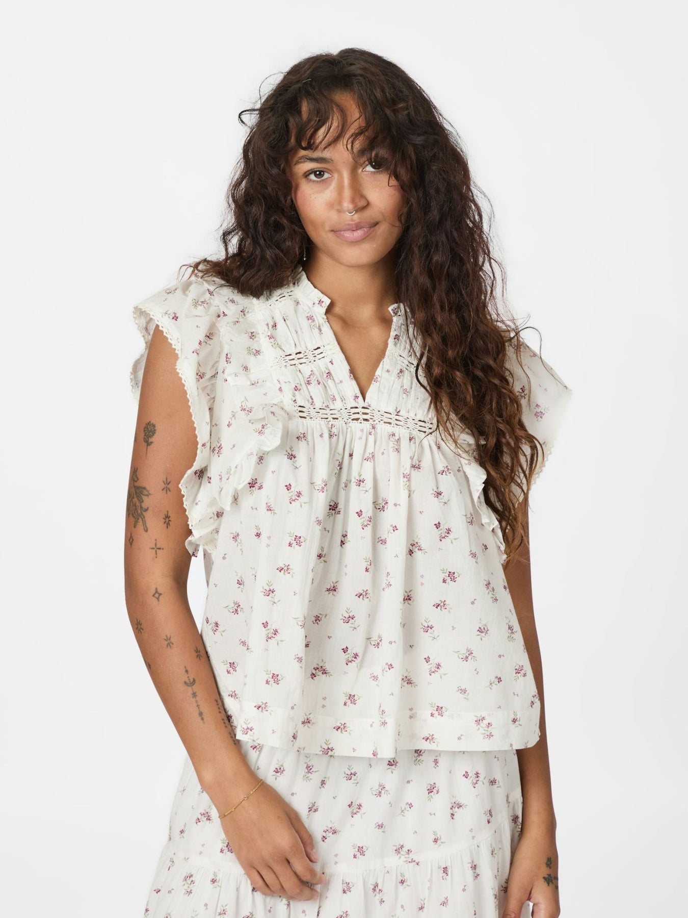 Jayla Small Blossom Top fra Neo Noir. Søt bluse med romantiske detaljer laget i lett bomull. Jayla Small Blossom Top har et småblomstret mønster i dus rosa og dekorative volanger, blondedetaljer og fine legg foran og bak. Ermene faller som vinger over skuldrene, mens den løstsittende fasongen gjør den både komfortabelt og feminint.