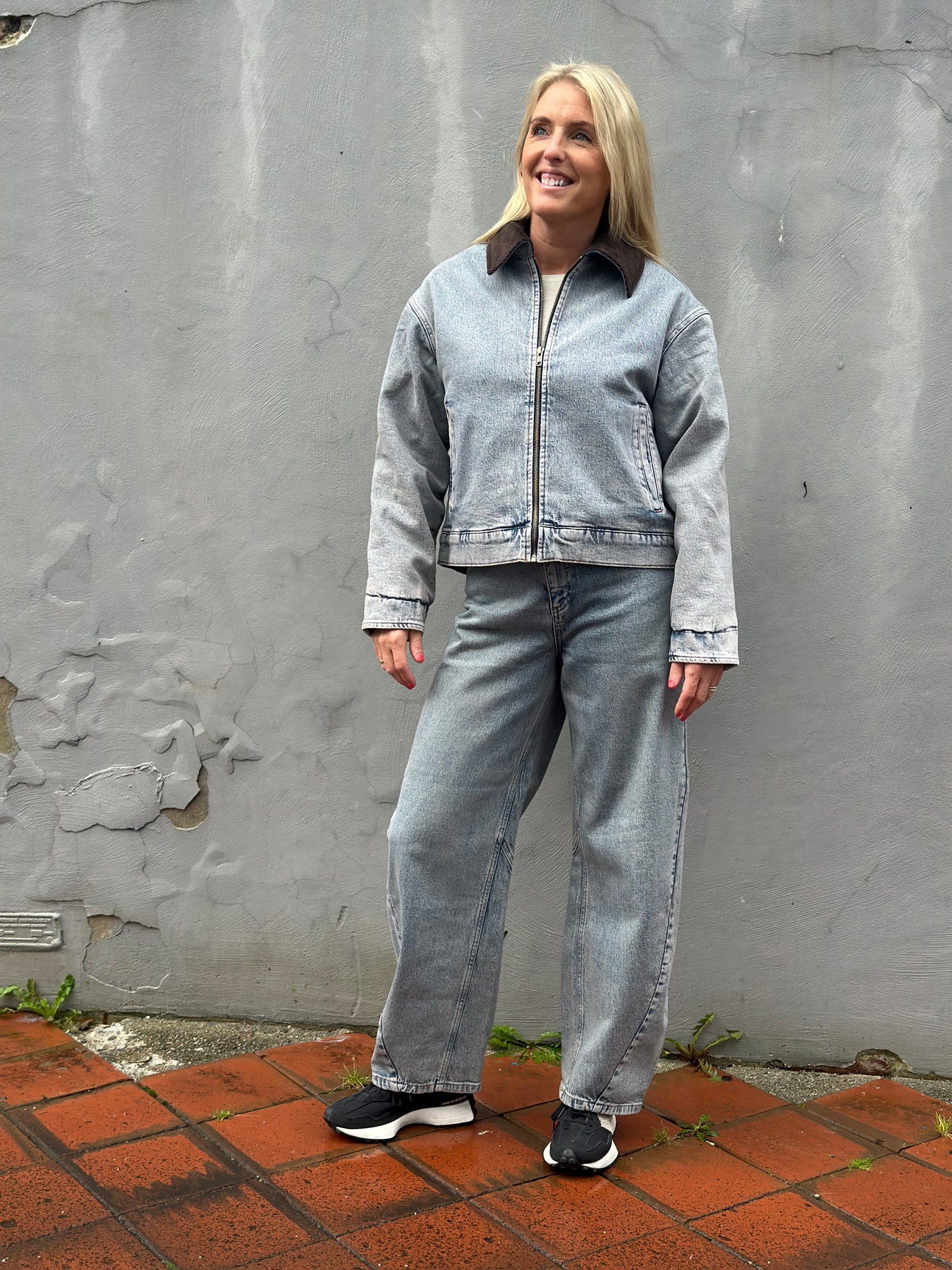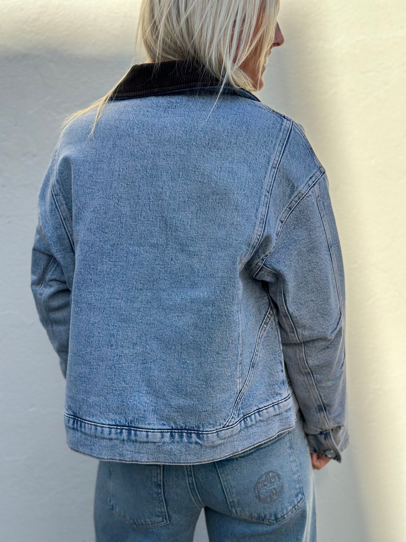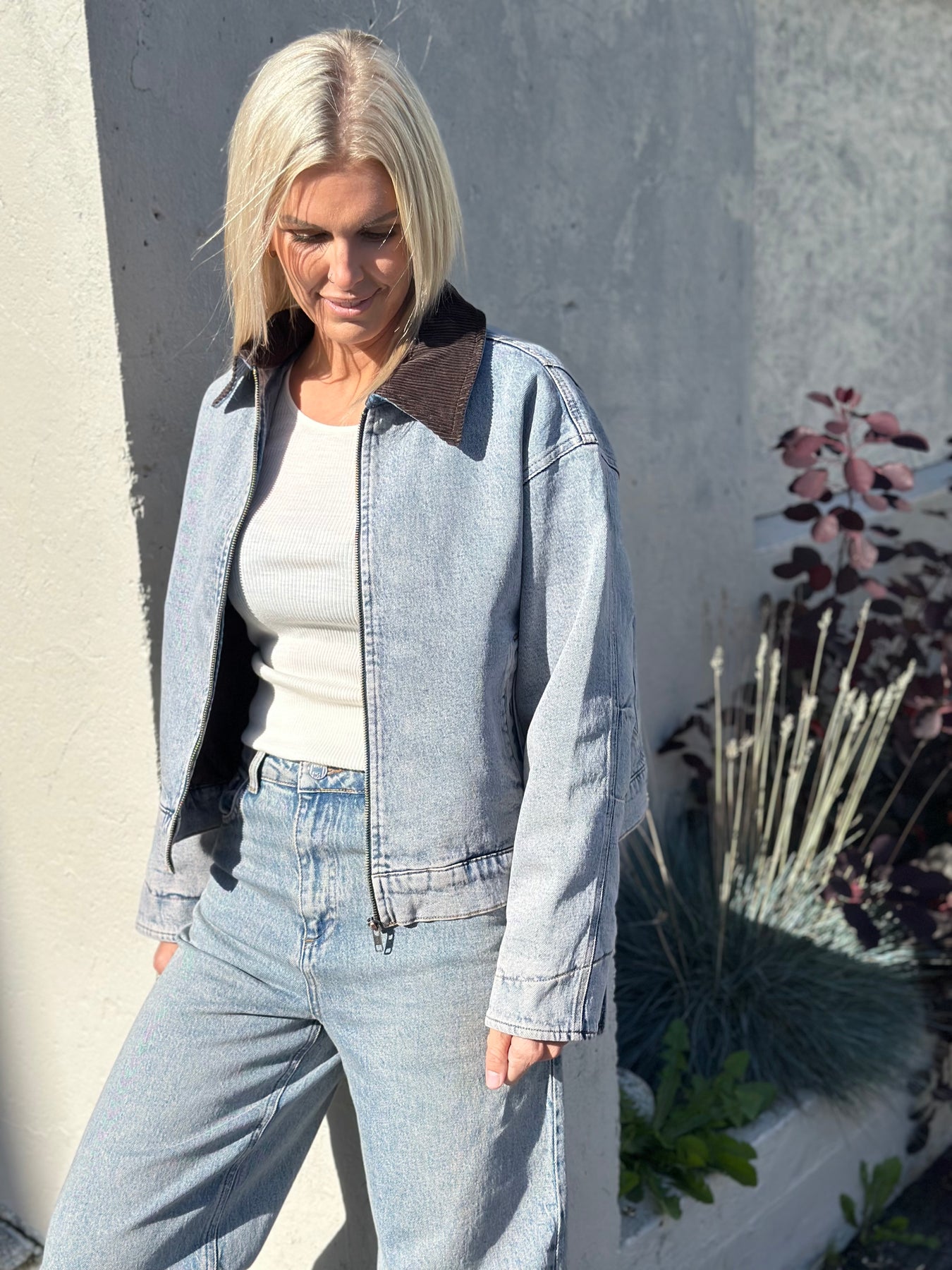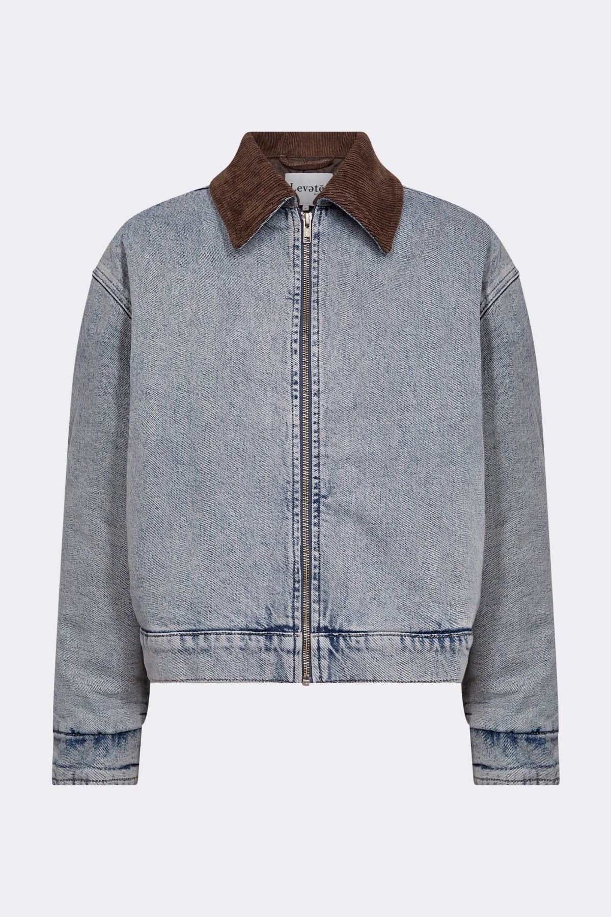 jakken har kordfløyelskrage, glidelåslukking