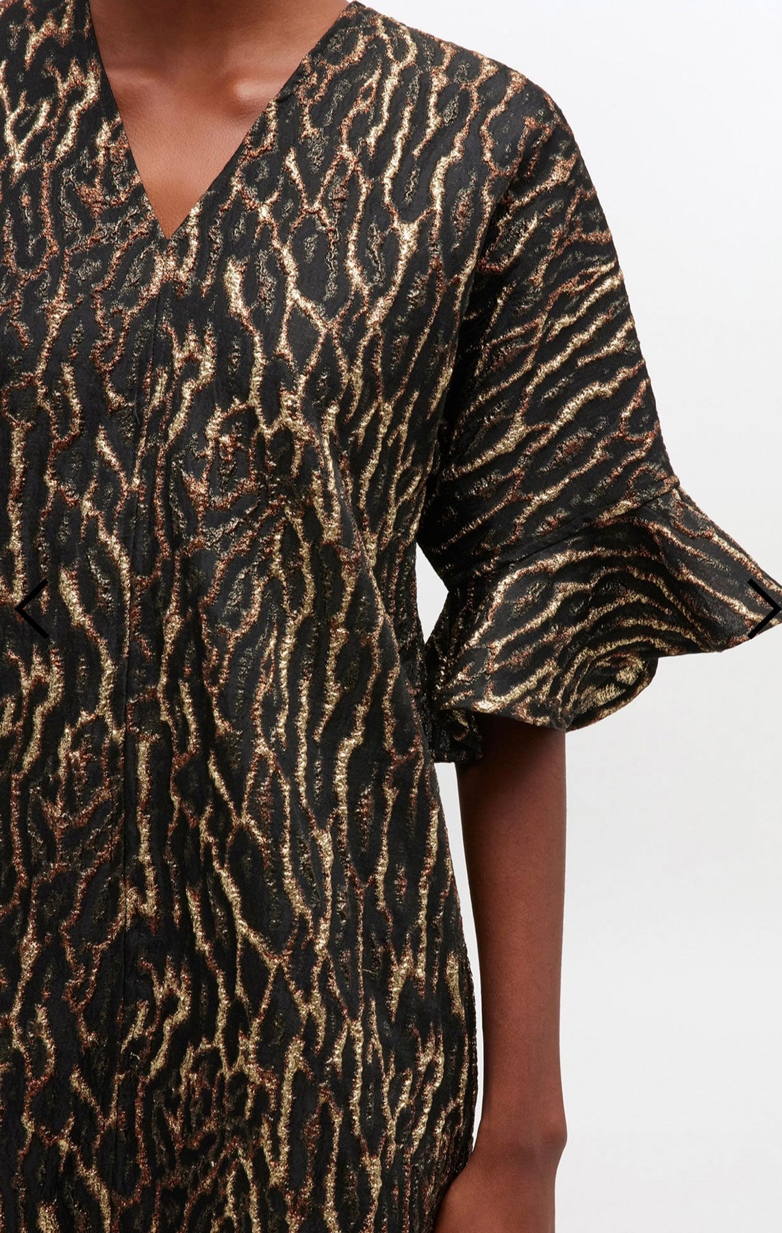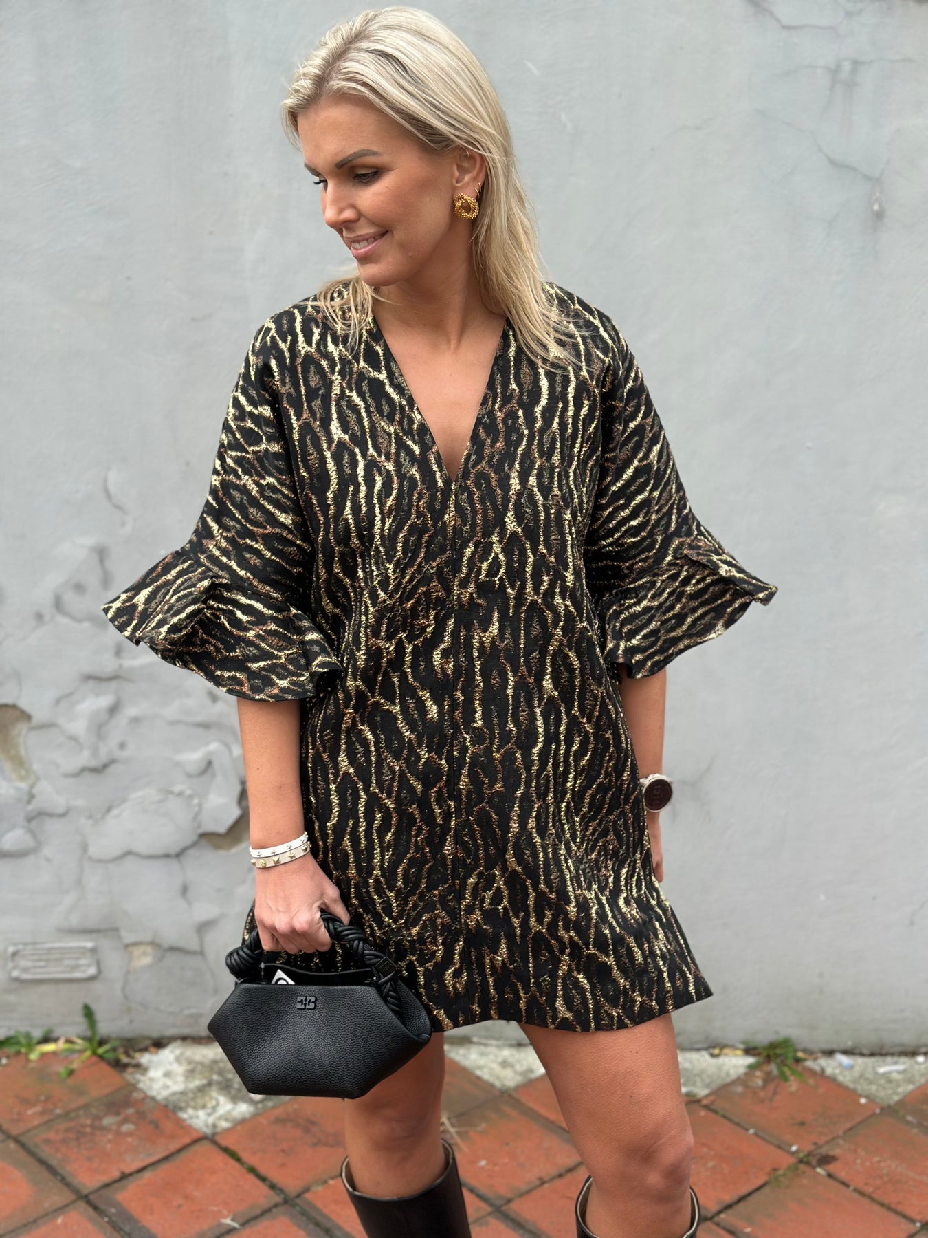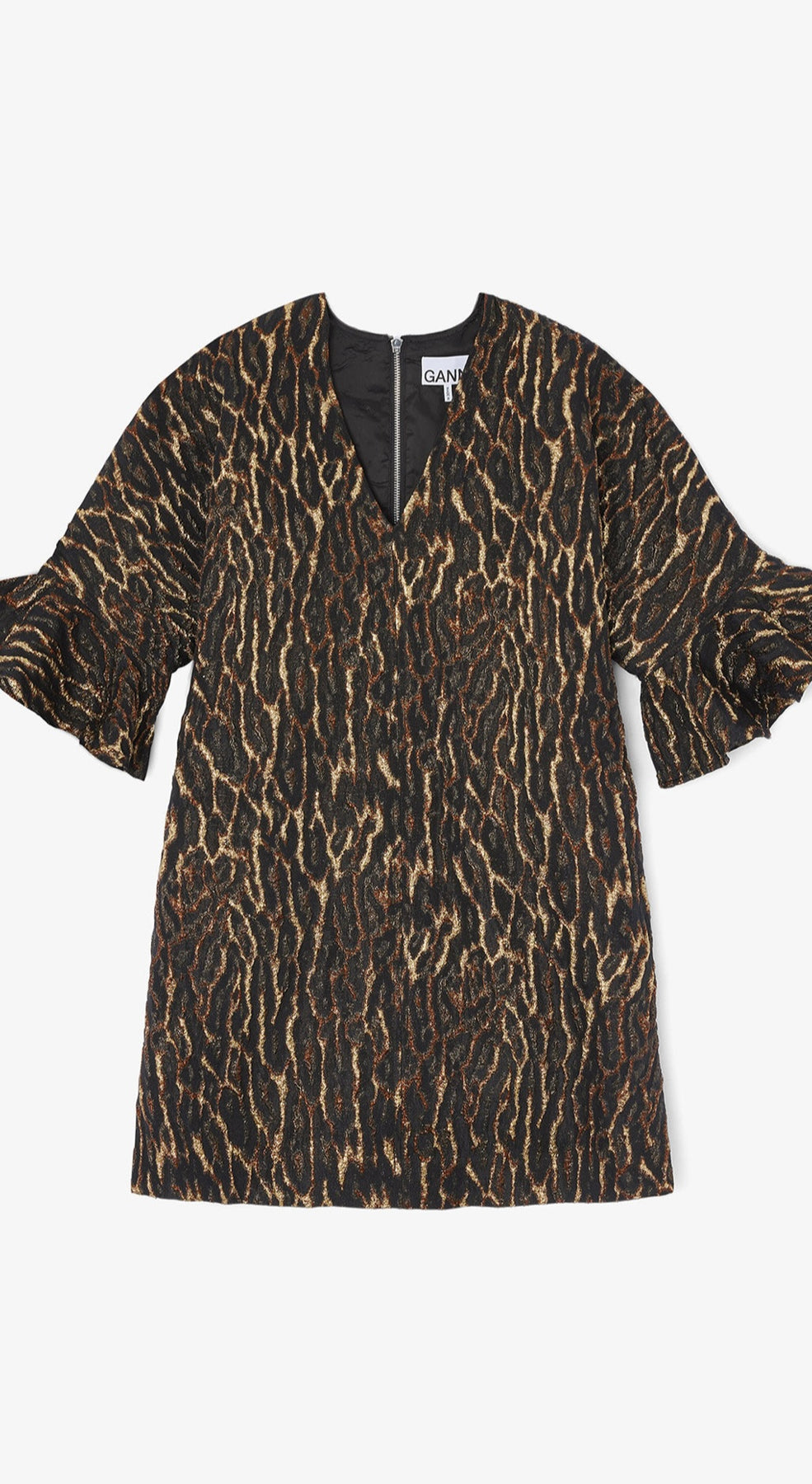 Statment kjole fra GANNI i en boxy passform med v-utringing, et fantastisk print i metallic og strutter i ermer.
