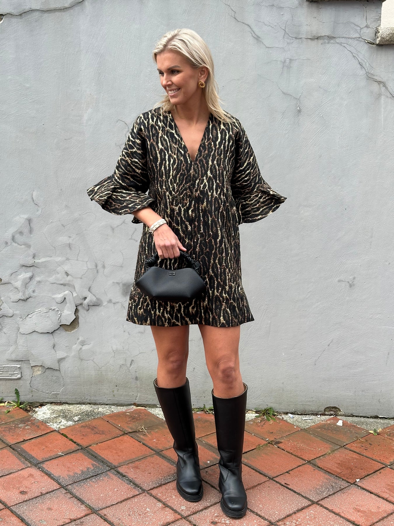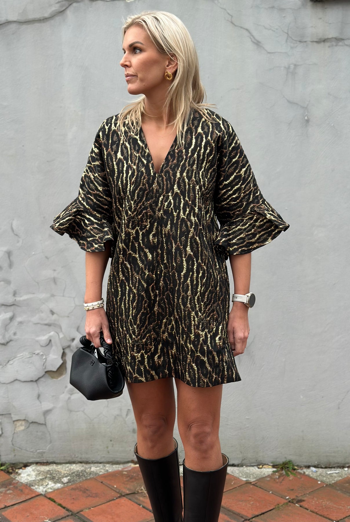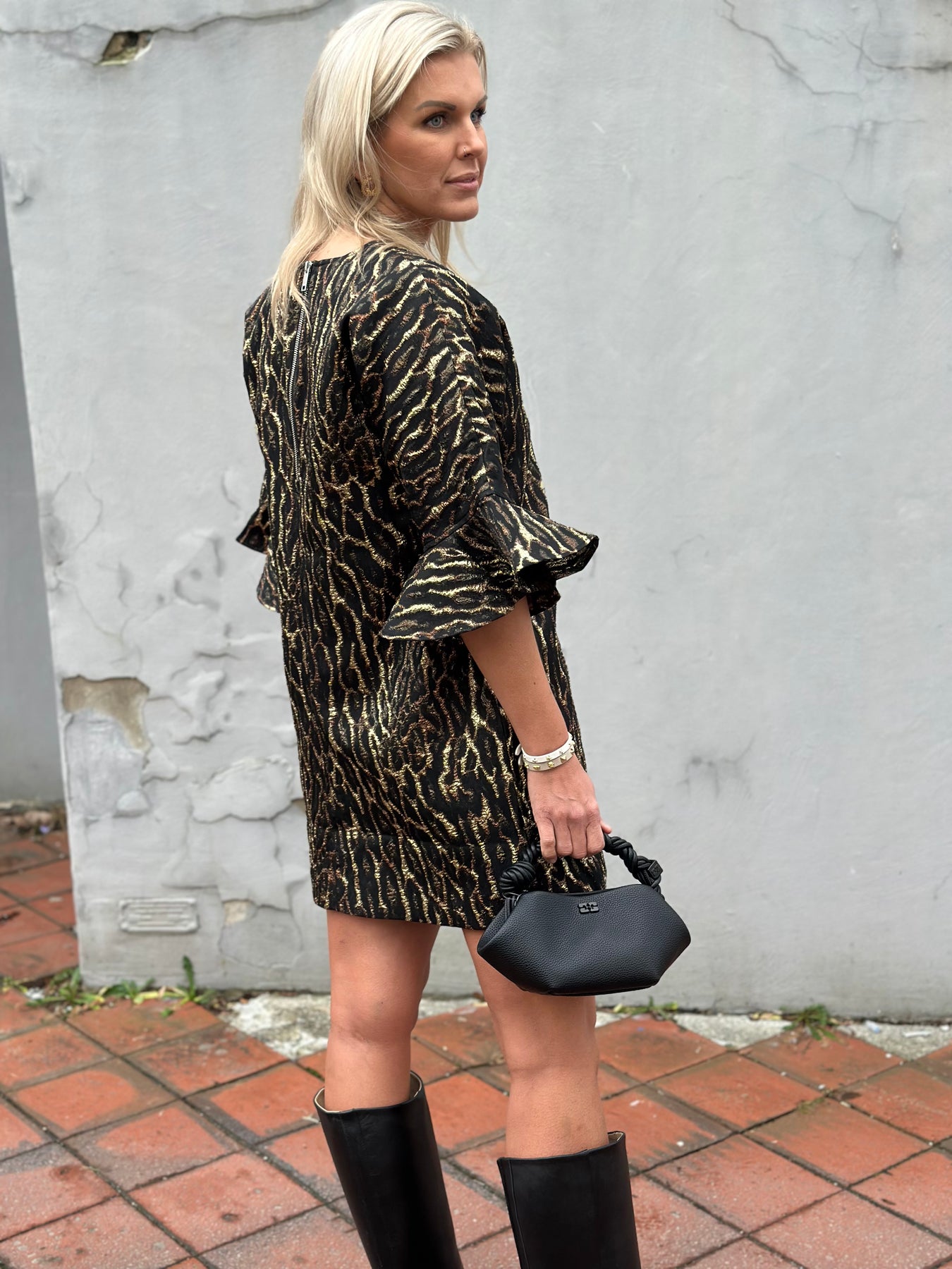 Statment kjole fra GANNI i en boxy passform med v-utringing, et fantastisk print i metallic og strutter i ermer.