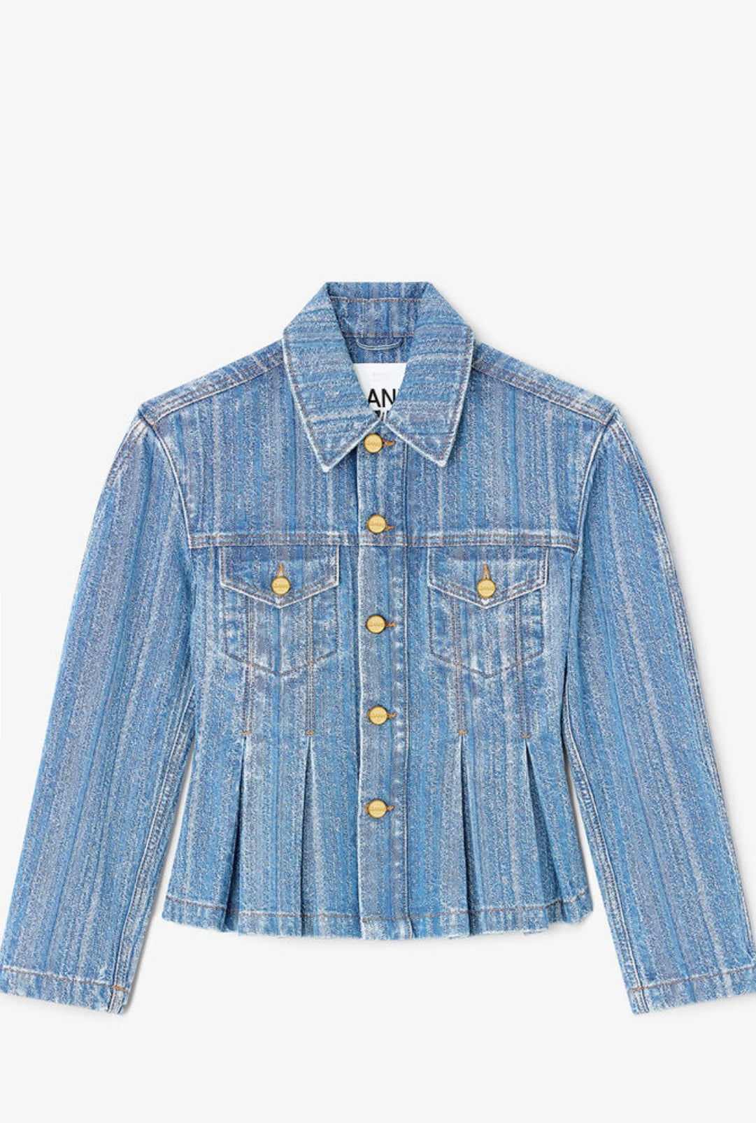 Denimjakken har en klassisk krage, knappelukking foran, to brystlommer og en plissert detaljen i midjen.