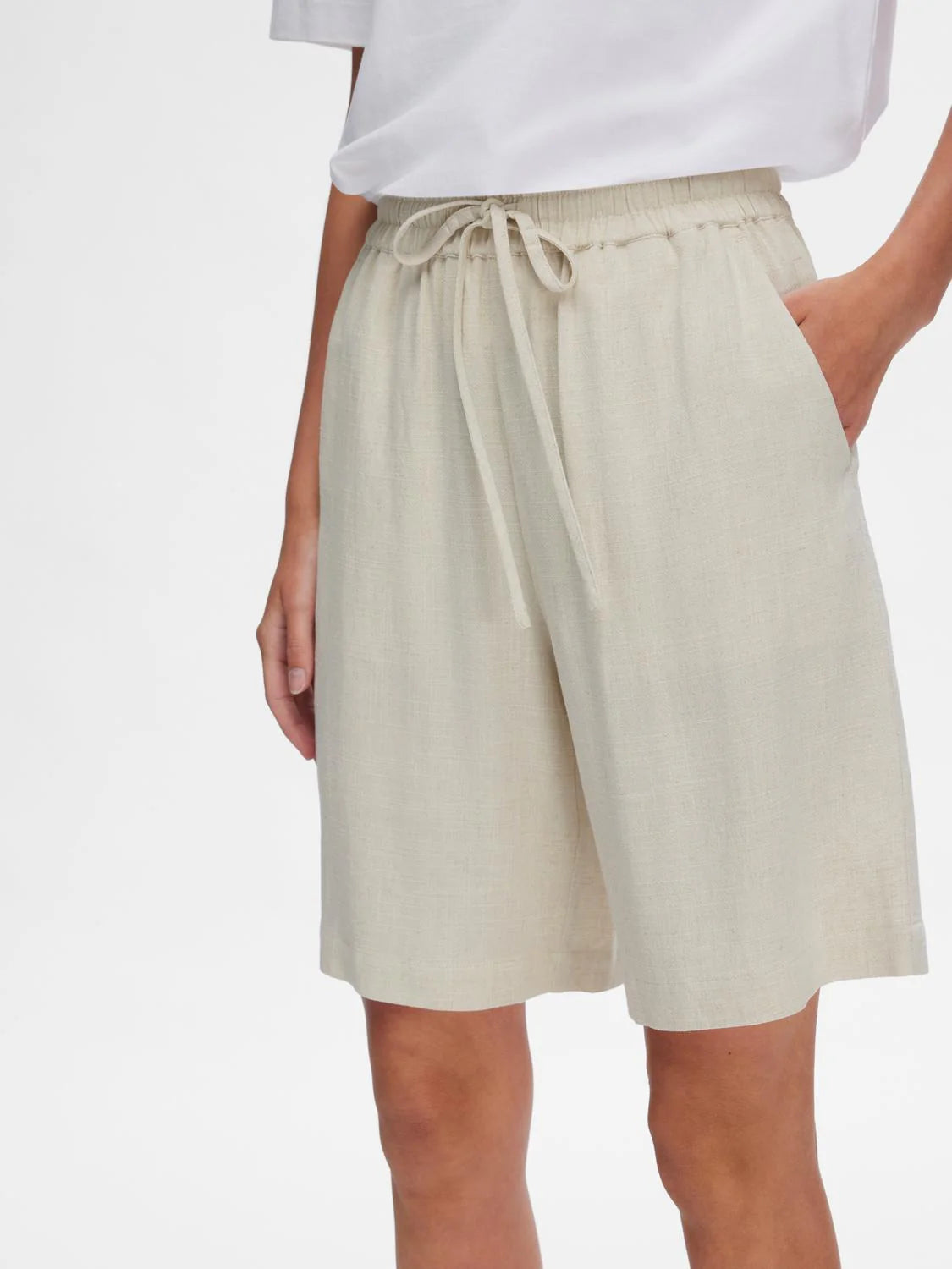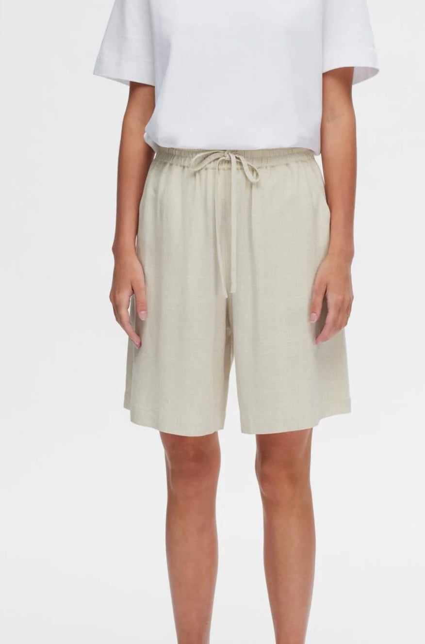 Viva Mw Shorts fra Selected Femme. Denne shortsen i linblanding er det ultimate plagget når solen skinner. Den er laget i et lett og pustende stoff med en komfortabel passform som gir full bevegelsesfrihet. Den elastiske linningen med justerbar snøring sikrer en fleksibel og behagelig passform, mens sidelommene gir en praktisk touch. Style den som et matchende sett med våre topper i linblanding, og fullfør looken med et par sandaler for en avslappet og stilfull sommerstil.