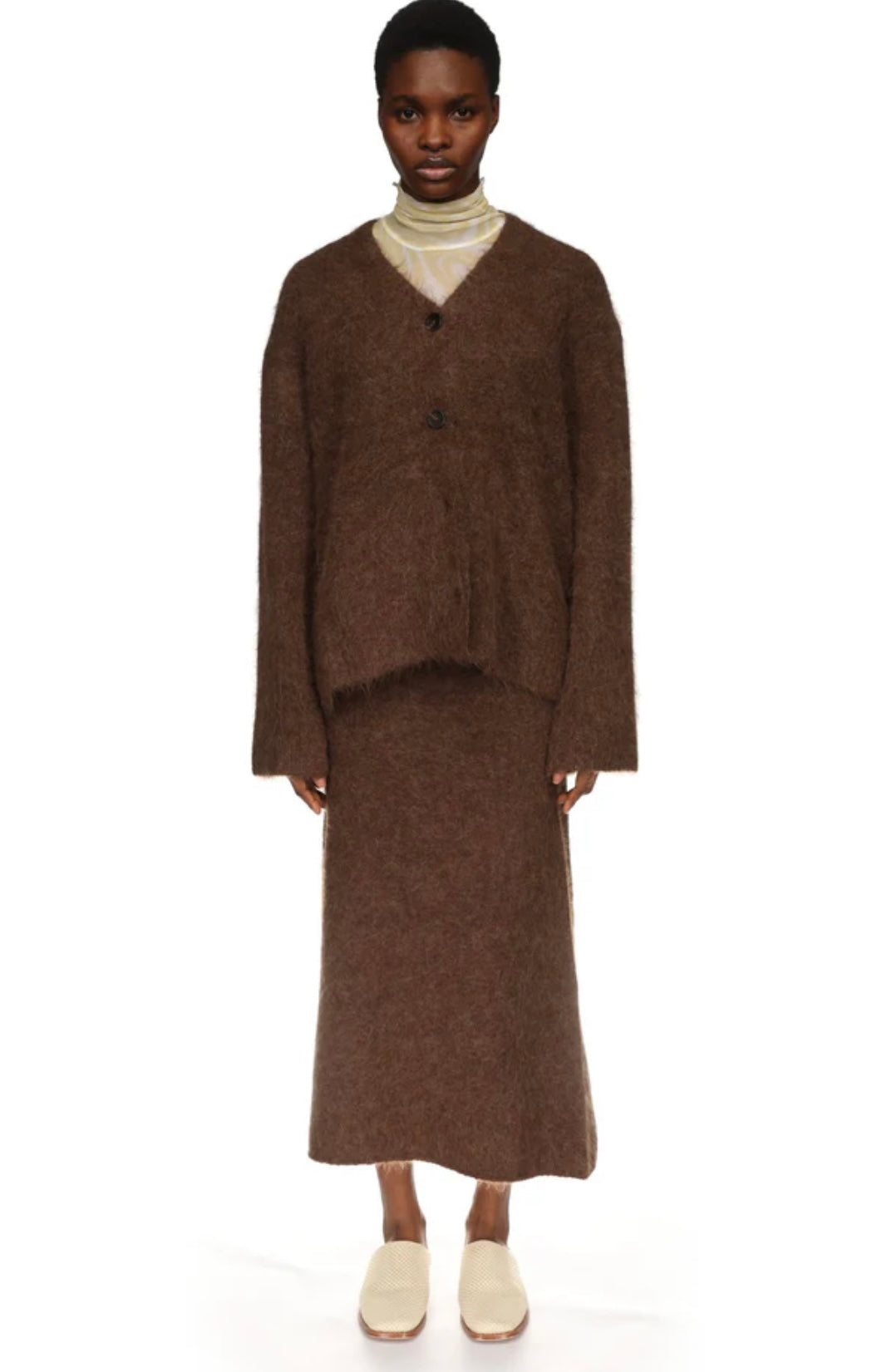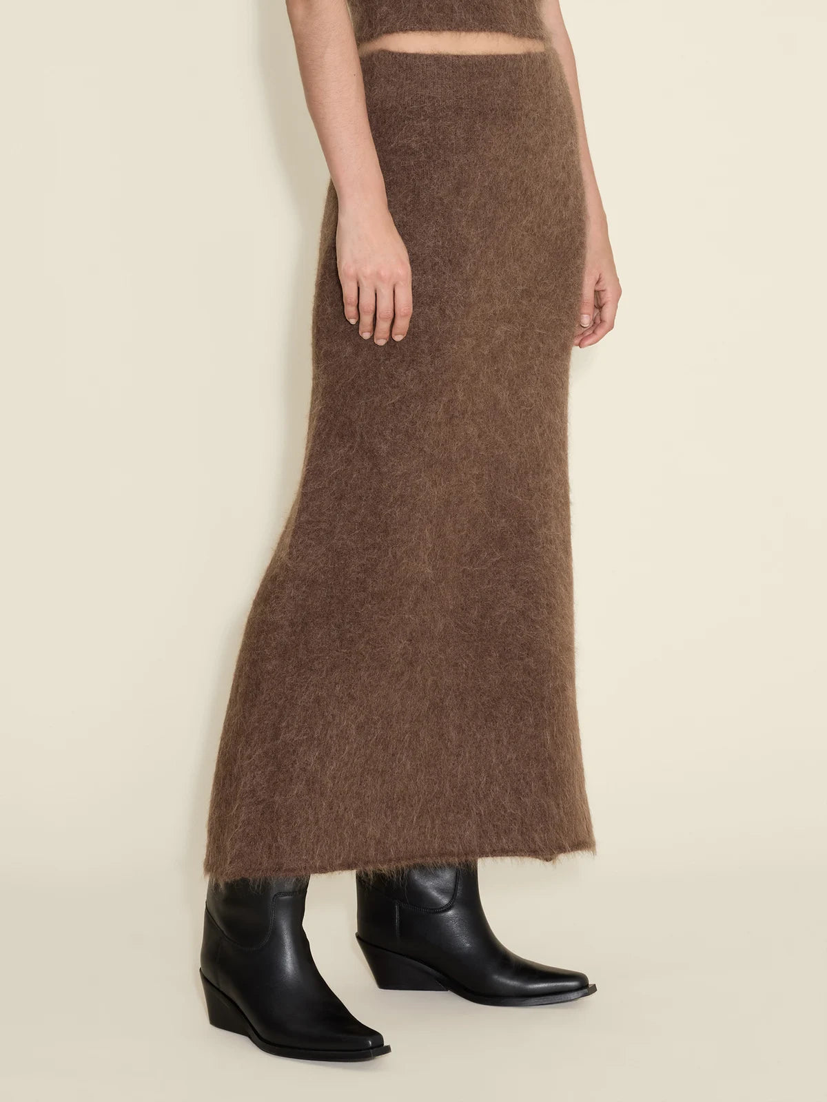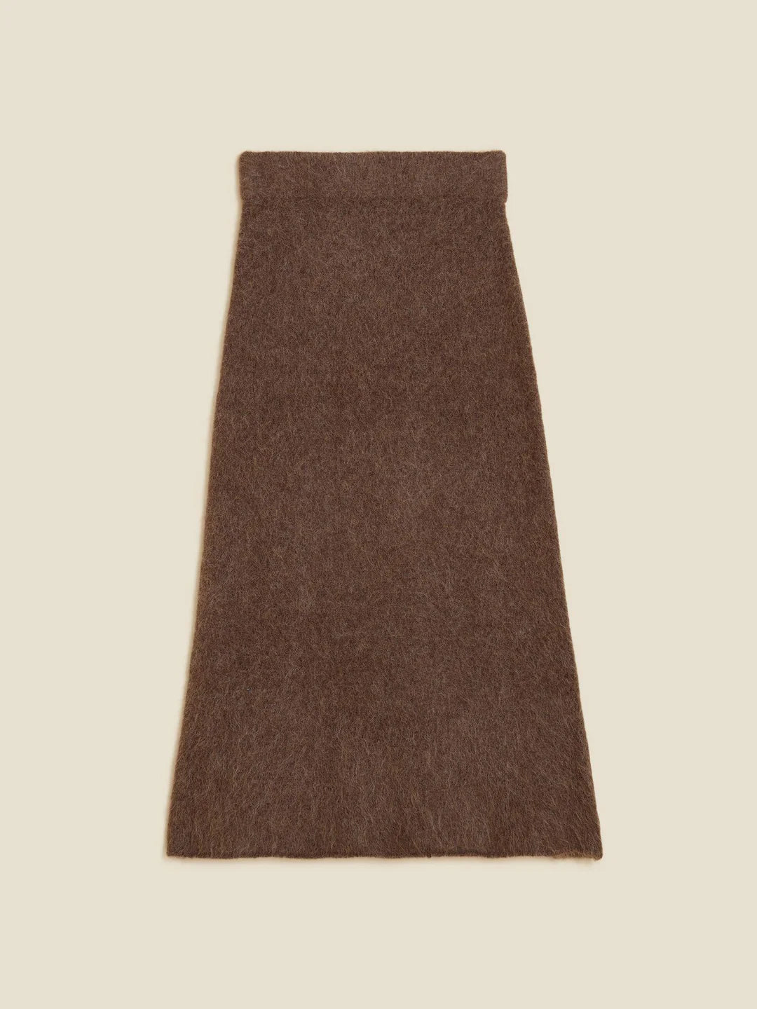 Fure Fluffy Skirt fra Holzweiler. Langt ullskjørt i dyp brunfarge i nydelig kvalitet med strikk i livet.