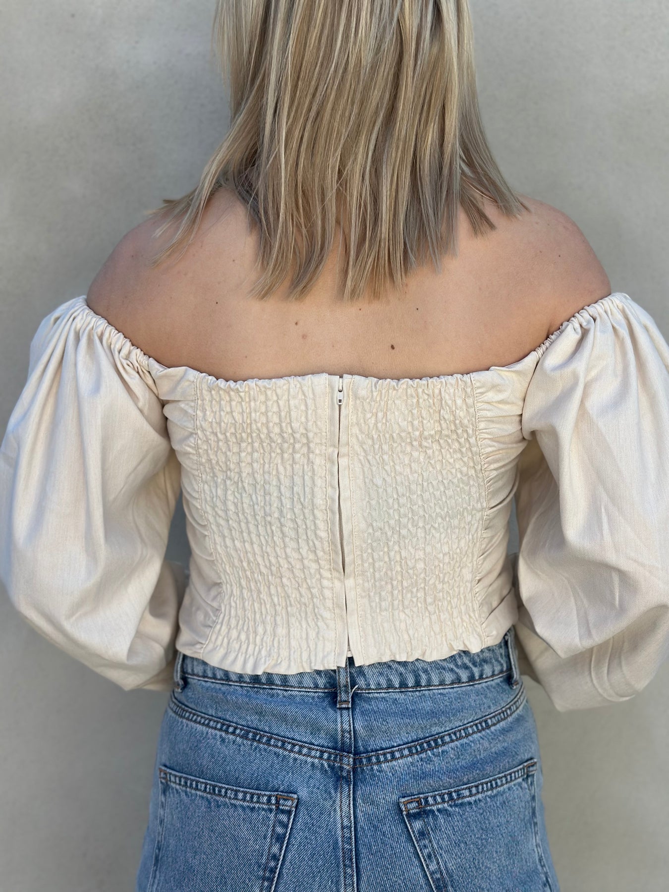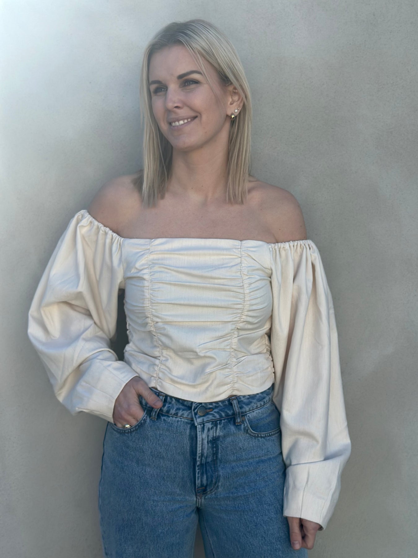 Topp fra Gestuz som kan brukes på og av skuldrene . Cropped model som passer perfekt til bukser med høyt liv og skjørt.