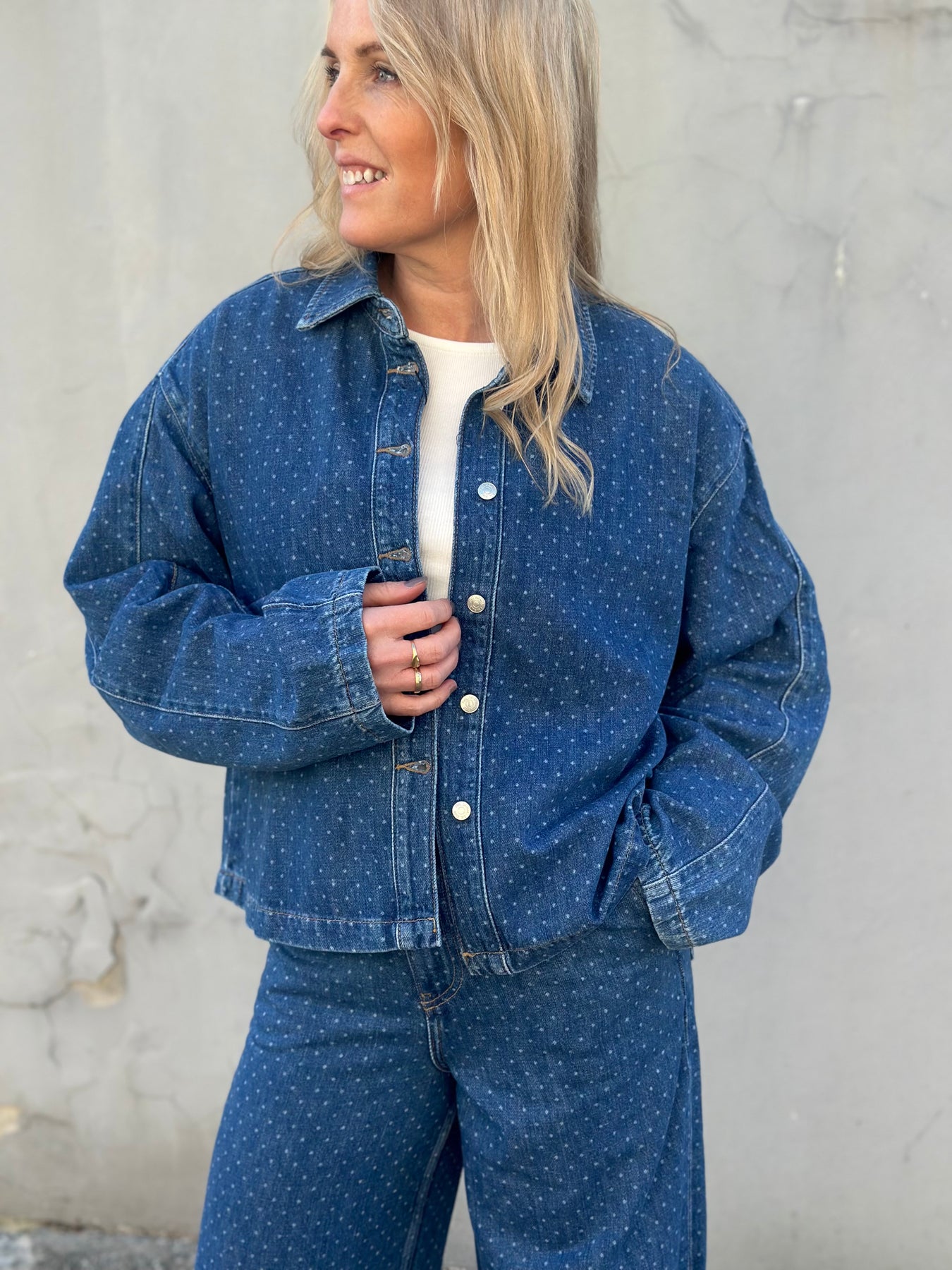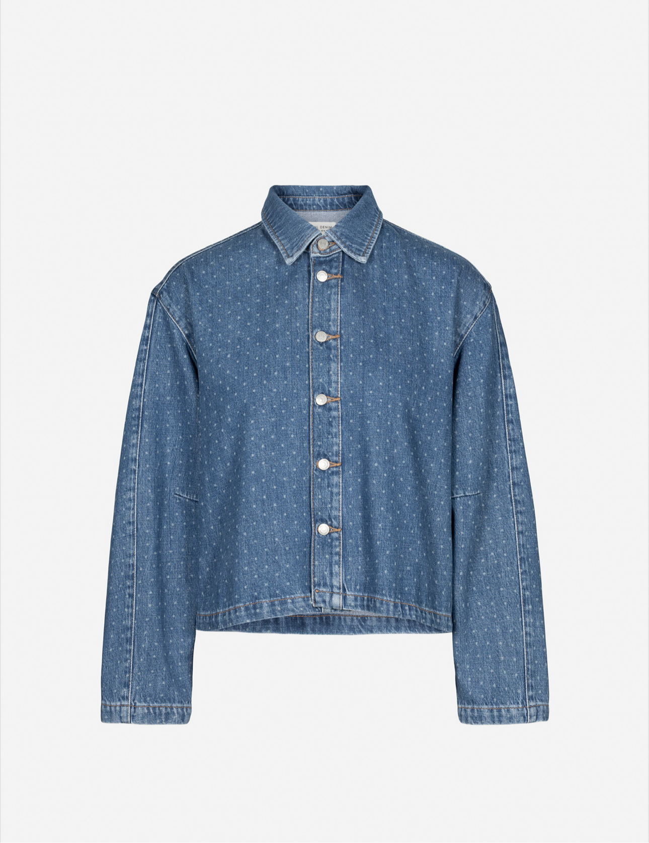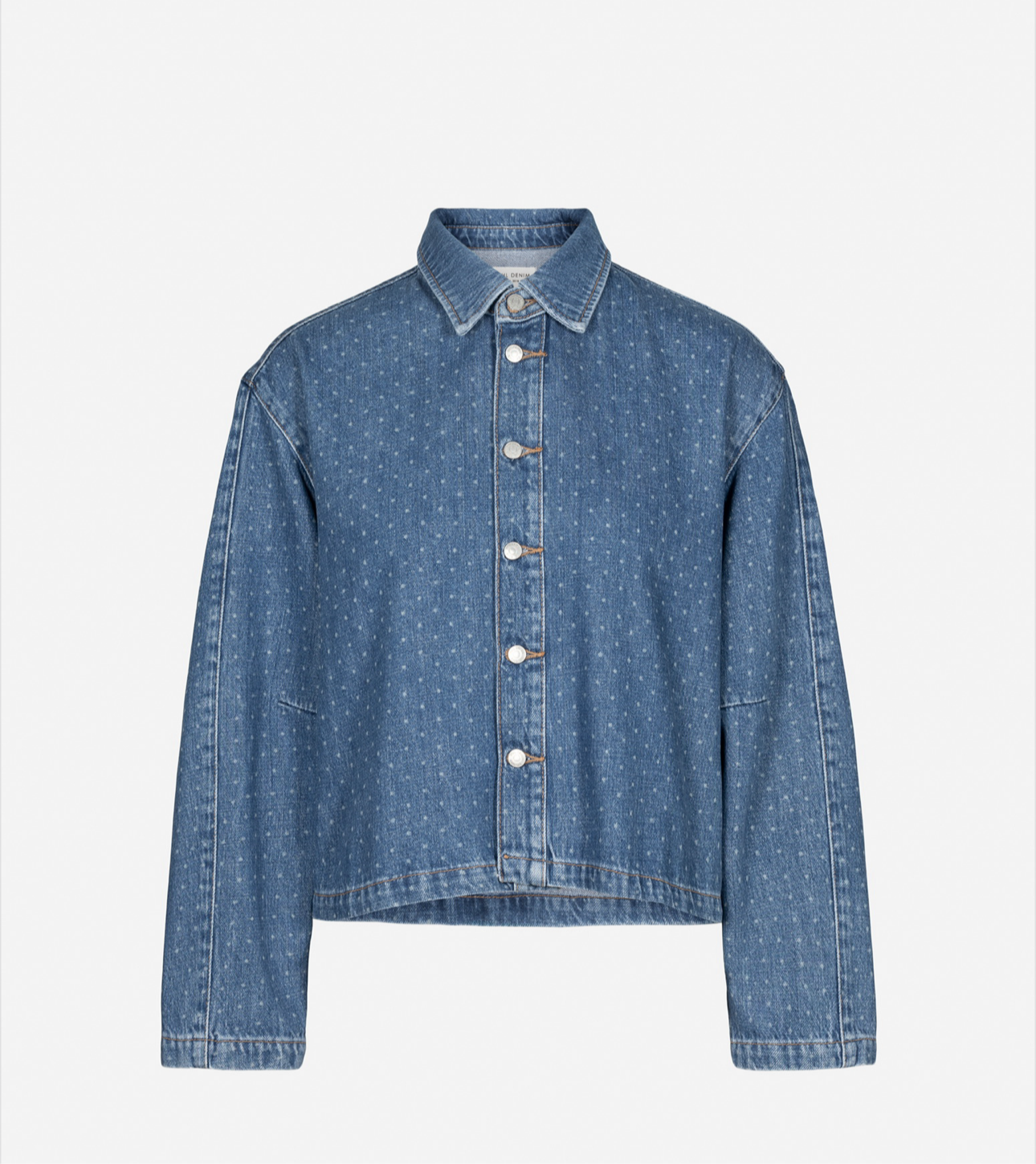 Marley Shirt fra Camilla Pihl er en moderne tolkning av den klassiske jeansjakken, laget i strukturert blå denim med et subtilt prikket uttrykk.