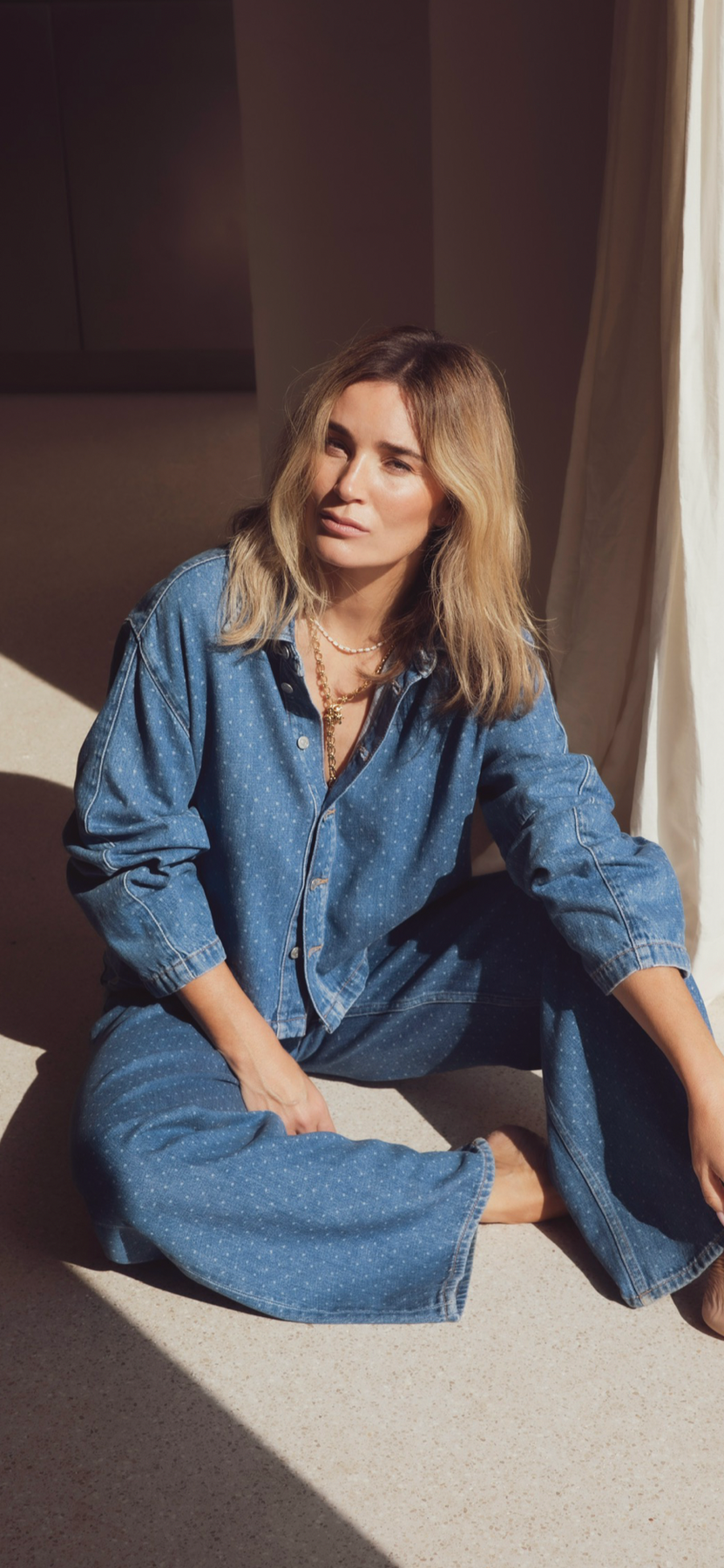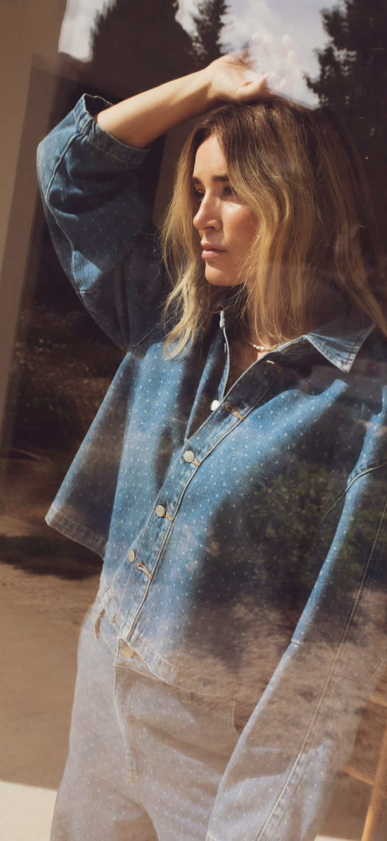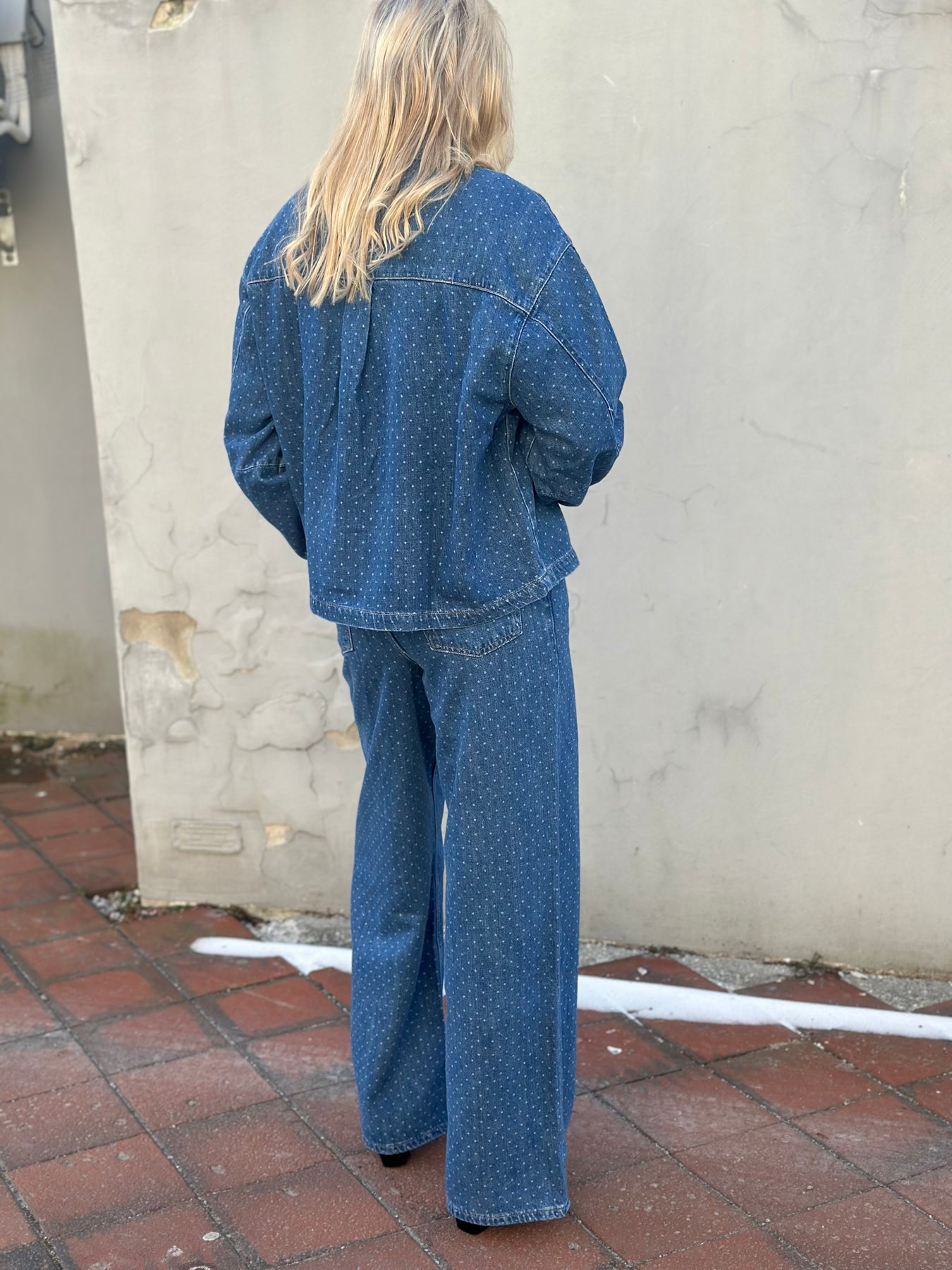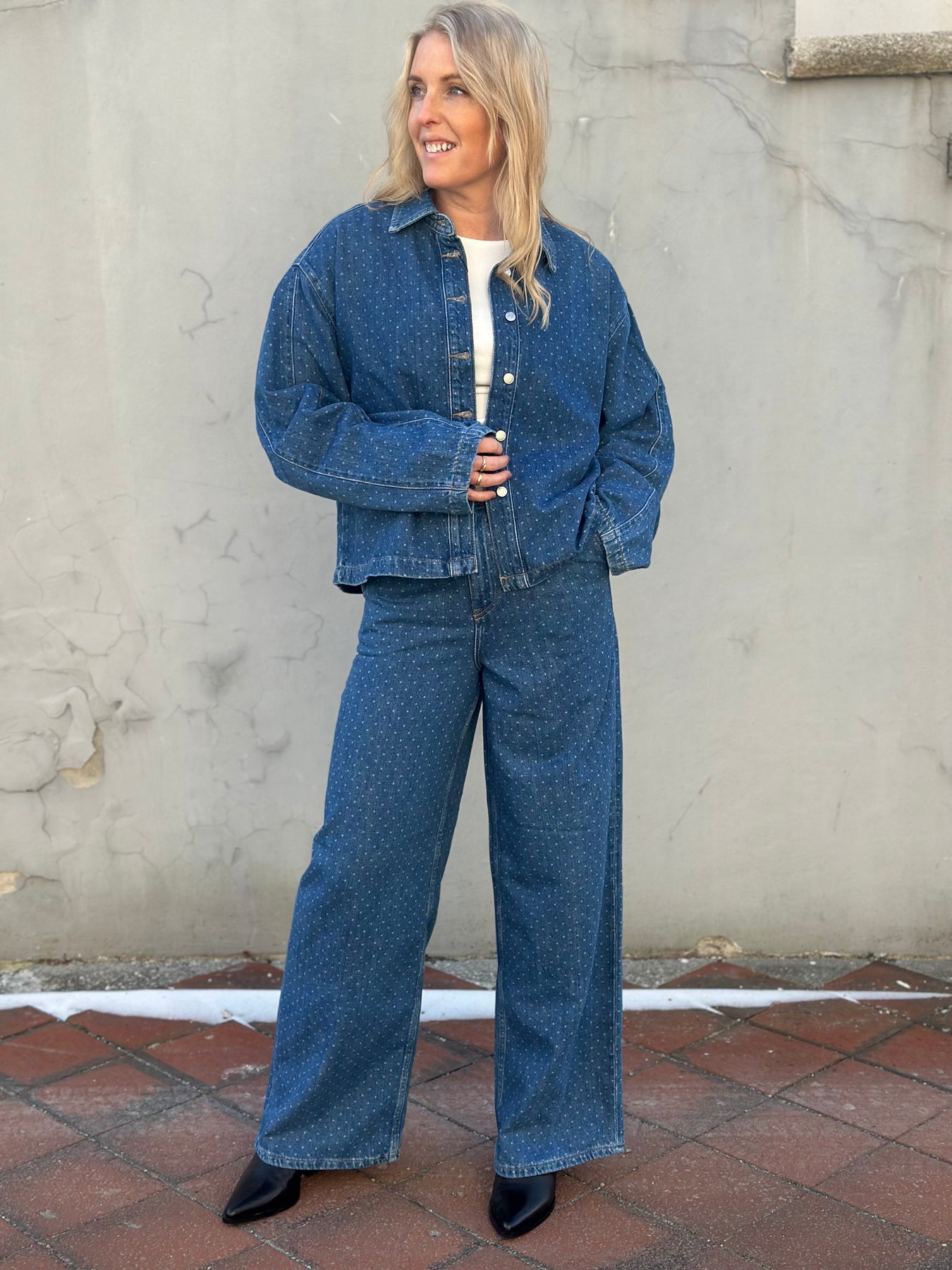 Marley Shirt fra Camilla Pihl er en moderne tolkning av den klassiske jeansjakken, laget i strukturert blå denim med et subtilt prikket uttrykk.