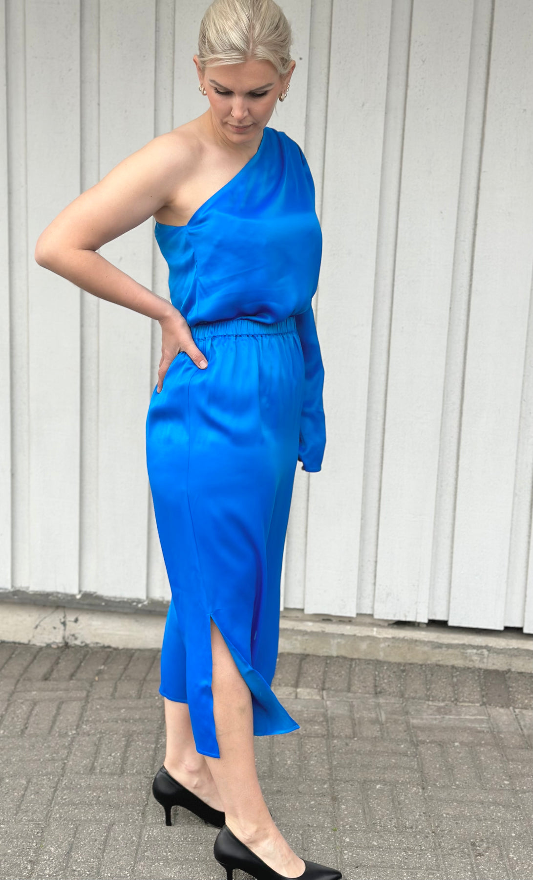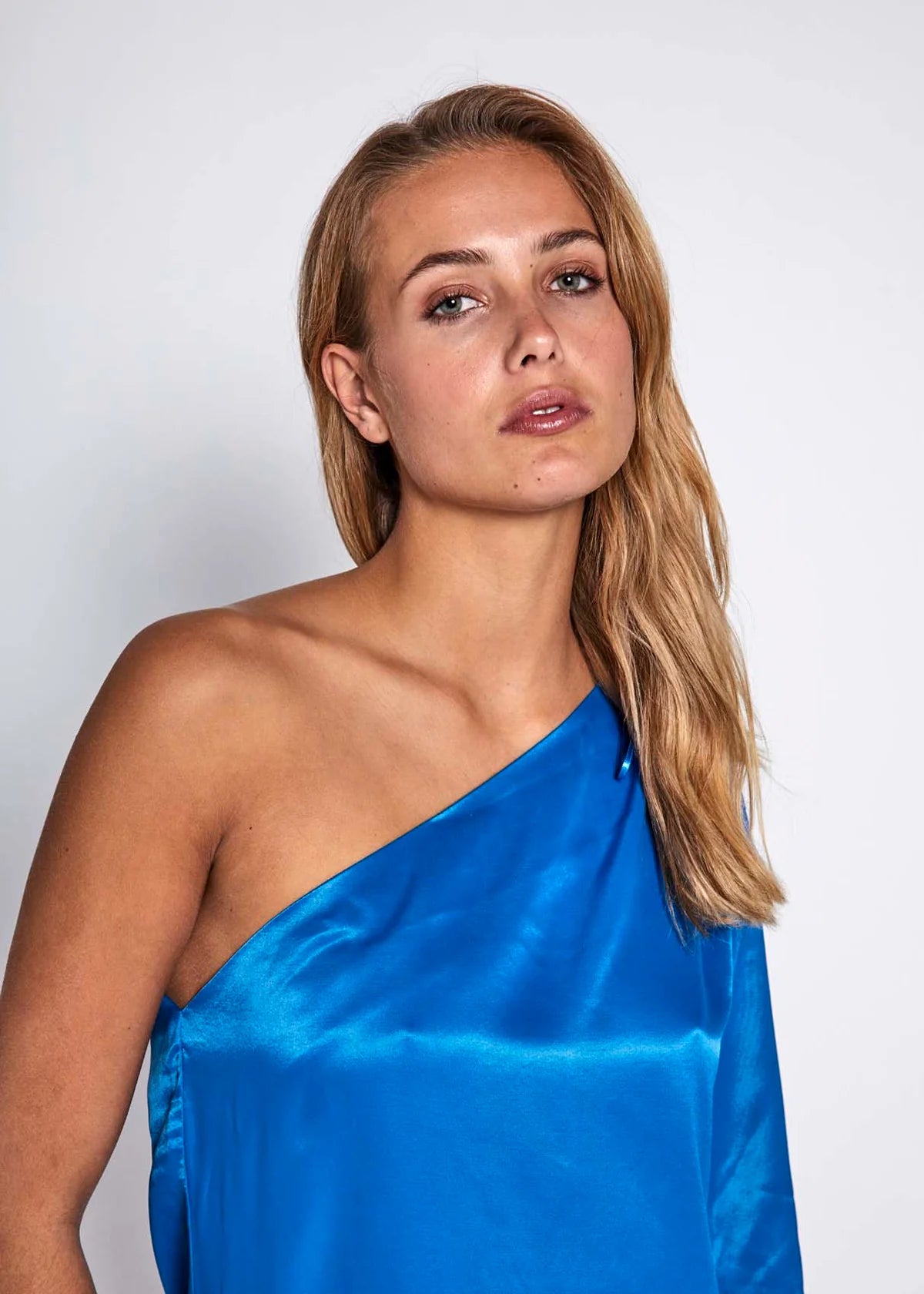 Lekker satenglignende topp i nydelig viskose. Oneshoulder med lang erm og løs passform. Sammen med portia skirt blir dette et antrekk til bryllup og fest, men alene kan du gjerne style til en lekker skinnbukse eller en lett bukse og skjørt. 100% viskose