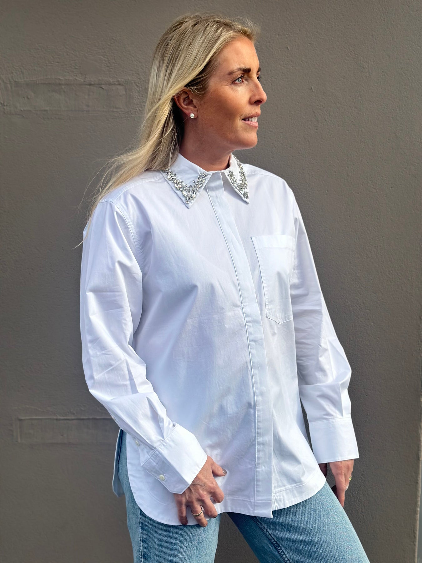 Spika Shirt fra Copenhagen Muse. Storskjorte med buede kanter nederst og splitt i siden. Nydelige strassdetaljer på kragen og en stort brystlomme. Skjorten er perfekt under vest og gensere, men superlekker alene også!