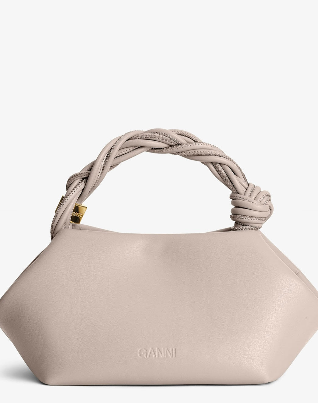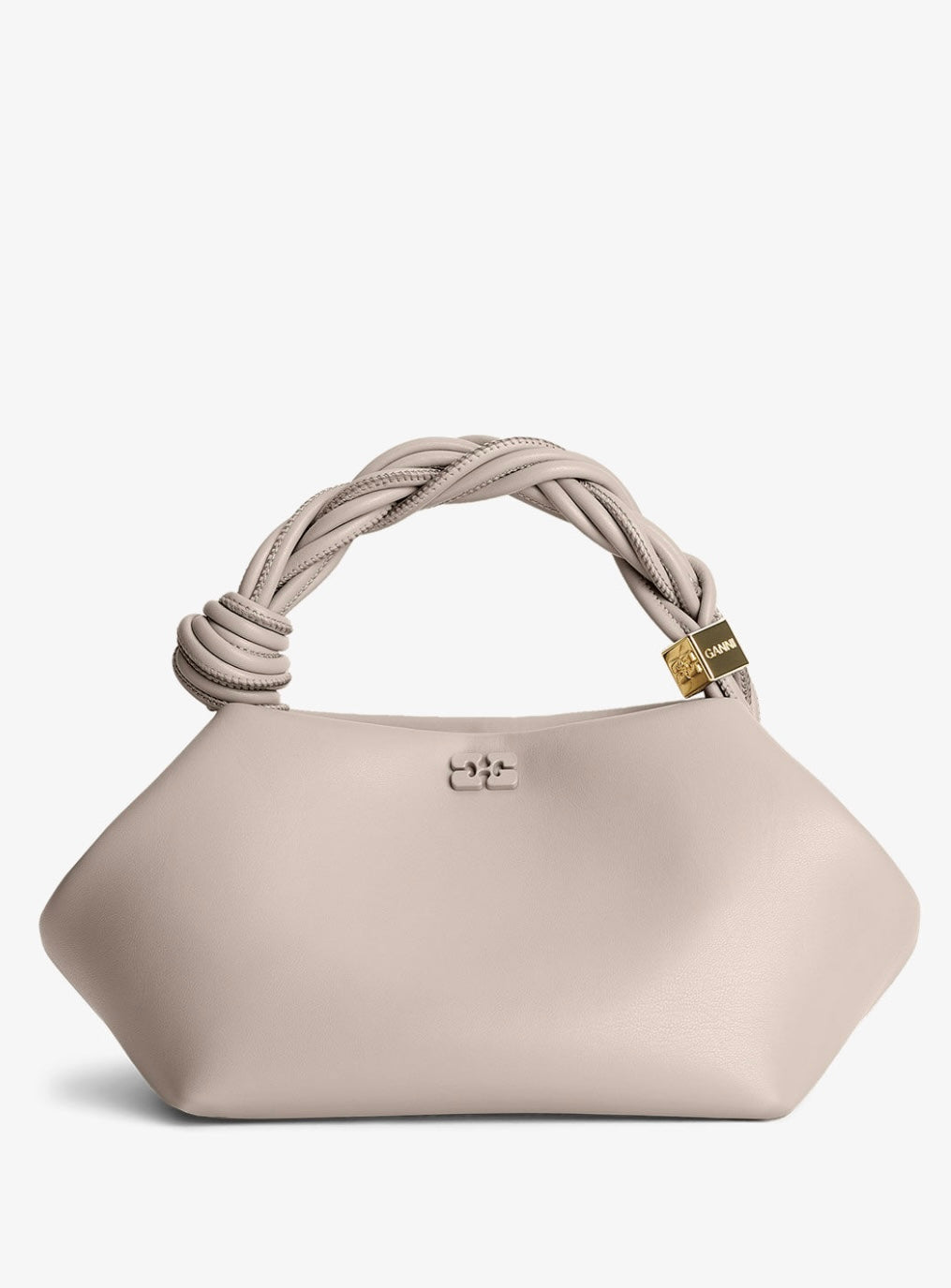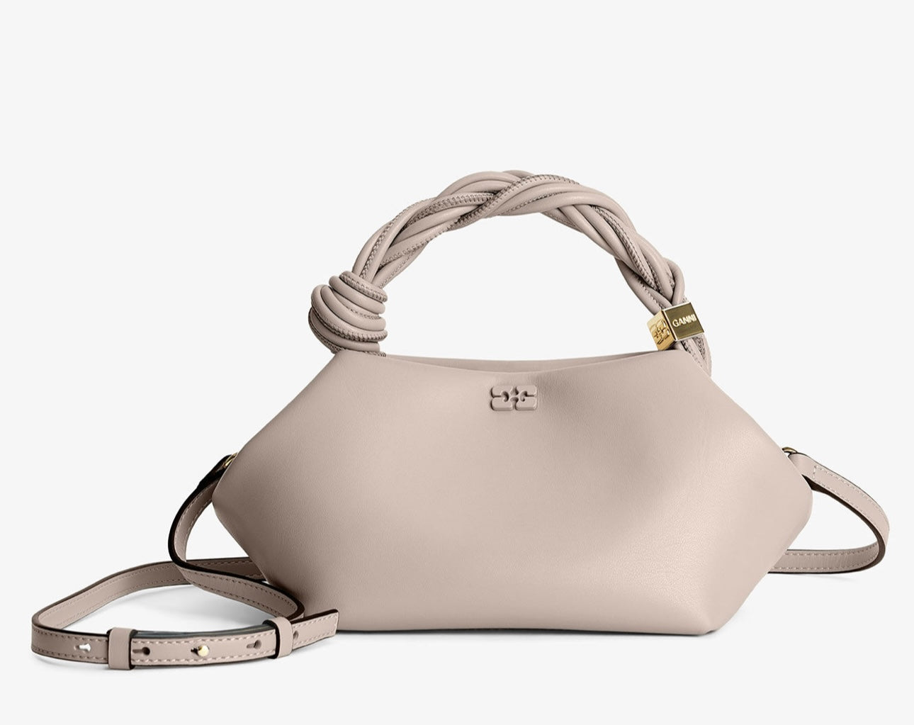 Small GANNI Bou Bag har en metalliske ton-i-ton GANNI Butterfly-logo, et vridd håndtak med en flettet knute og en gullfarget, metallisk terning med en inngravert GANNI Butterfly-logo. Vesken har innvendig magnetlukking, en flat kortlomme på innsiden og en justerbar og avtakbar skulderrem for crossbody-bruk.