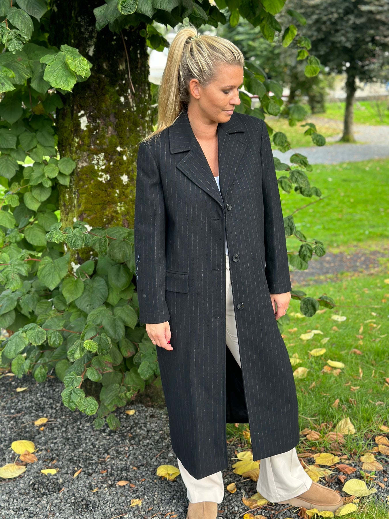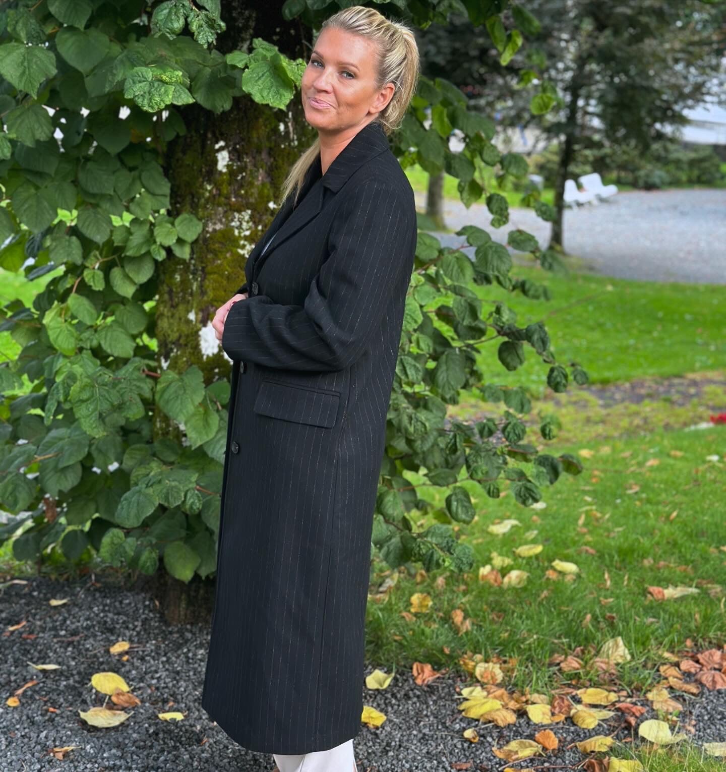 Alma Long Woolcoat fra Selected Femme. Klassisk lang ullkåpe med delikate striper. lommer på hver side i front med klaff og store knapper, splitt bak. Foret innside.