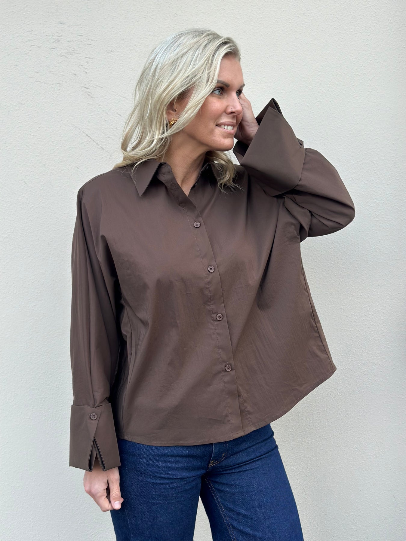 Favorittskjorten fra Iben nå i den perfekte brunfargen! Atari shirt er en kort storskjorte med vide ermer i en strykelett og herlig kvalitet. Perfekt å style til skjørt til pent, og jeans for en kul hverdagslook. 60% bomull, 37% polyamid, 3% elastan