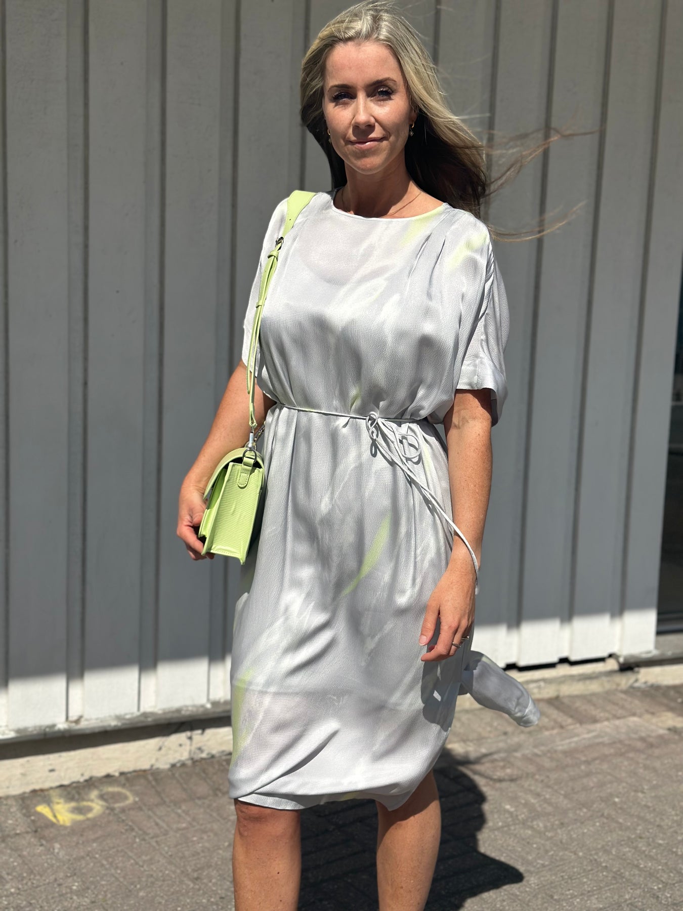 lang kjole i nydelig sateng. vide t-skjorteermer, rund hals og spennende snitt. Kjolen har lommer, splitt i siden og belte i livet. innerkjole i 100% viskose, Ytterstoff i 95% polyester, 5% elastan